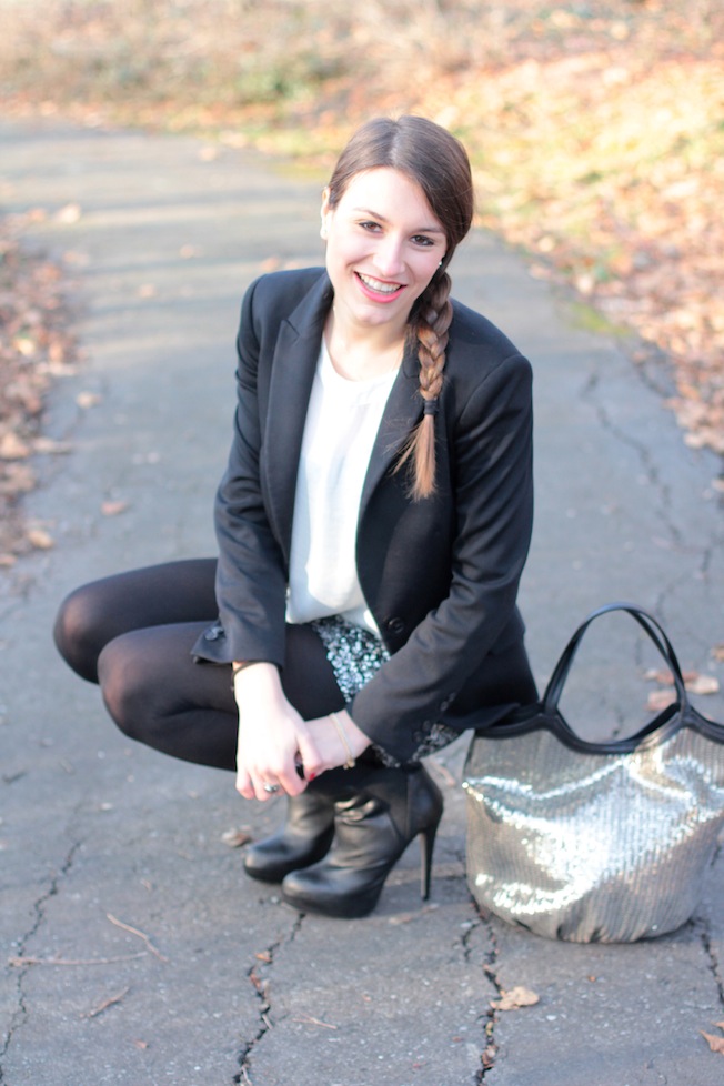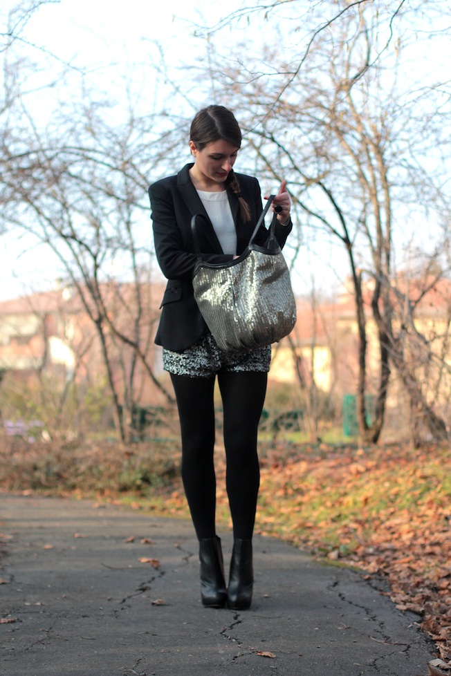 Buongiorno ragazze! Finalmente riesco a mostrarvi un nuovo outfit!! Avevo in mente questo look ancor prima di comprare questi shorts in paillettes che vi avevo mostrato qui (Sales and Purchases) e finalmente sono riuscita a fotografarlo per il blog! Ho abbinato gli shorts alla borsa sequin-metal di L’aura, a un blazer classico nero e ai nuovi boots di Timeless presi su Asos 🙂