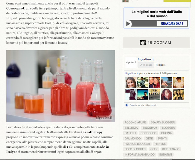 Ecco finalmente pubblicata su Bigodino.it la mia esperienza di Sabato scorso a Cosmoprof come Bigo-inviata!! Ho cercato di riassumere in poche righe quello che ho visto, testato e provato sui miei capelli e spero di poter trasmettere a tutte voi un po’ dell’atmosfera che si viveva in questi giorni in fiera a Bologna!