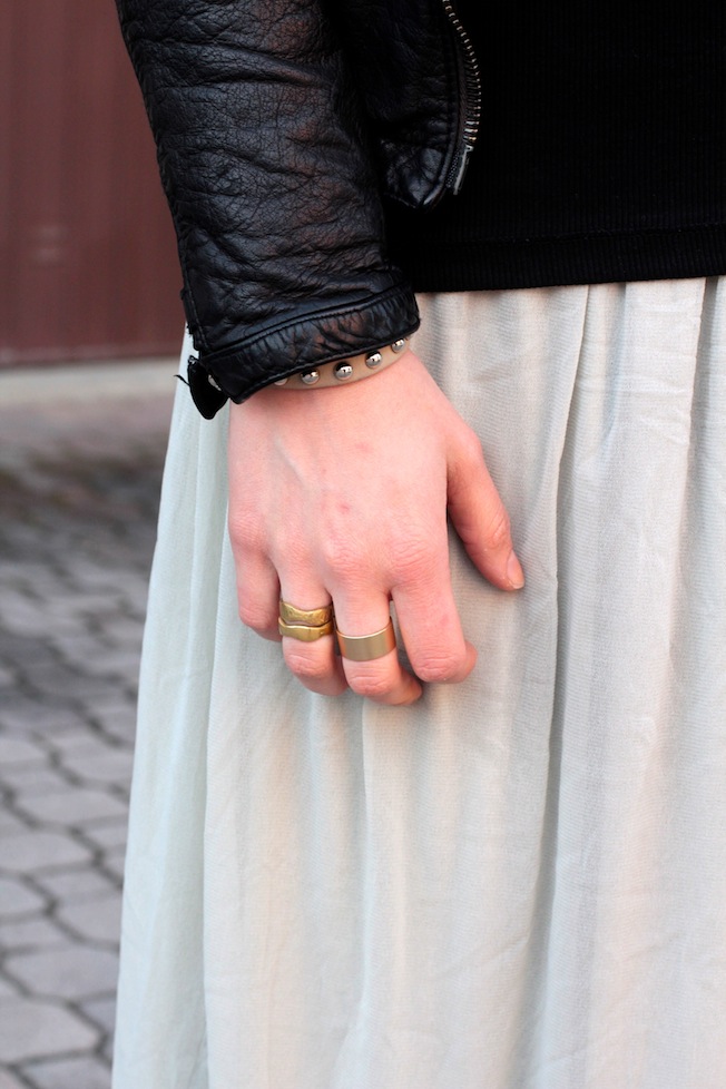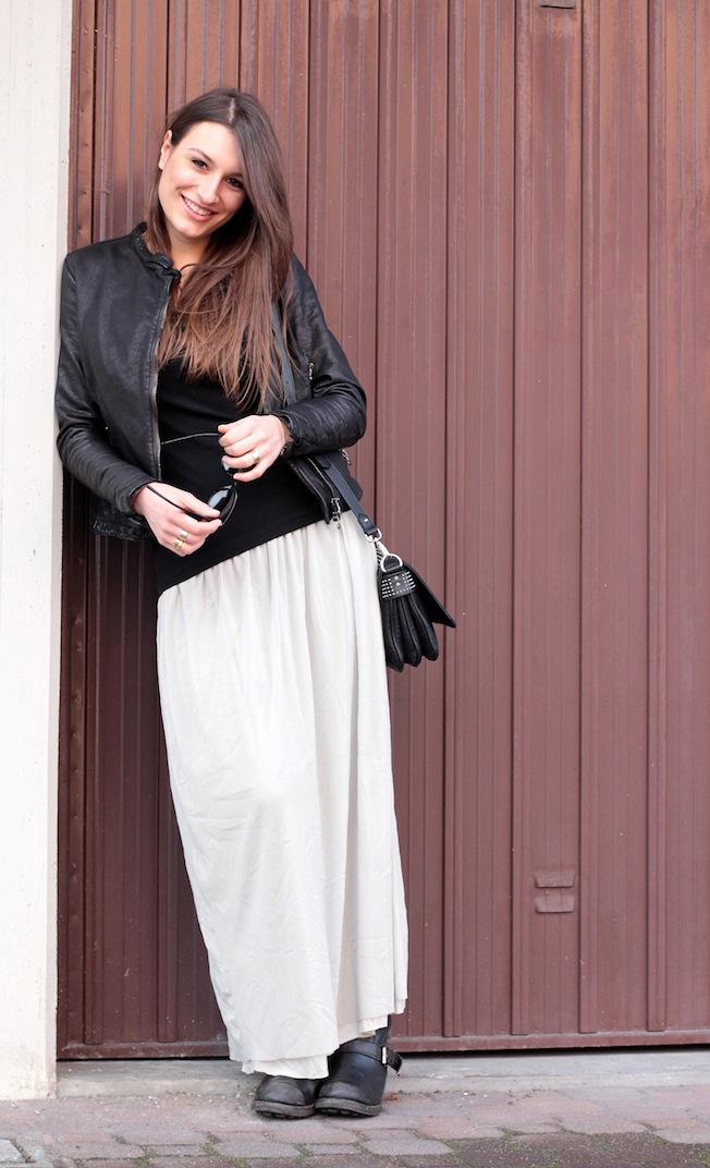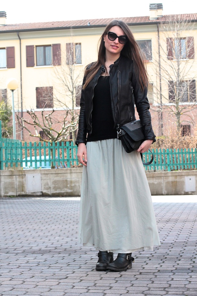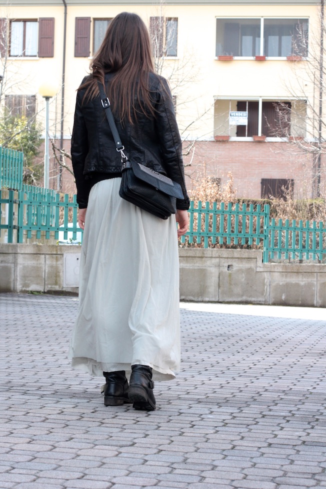 Ieri vi avevo mostrato la mia foto in camerino in uno dei miei negozi preferiti di Parma, CINQ, e non a tutti era piaciuta questa maxi gonna così, una volta tornata a casa, ho deciso di fotografarla subito sostituendola al maxi maglione che avevo indosso. Il look alla fine è risultato abbastanza rock e mi è piaciuto molto il contrasto tra il chiodo in pelle (preso sempre da CINQ), i biker e la borsa di PINKO con la gonna in tulle super delicata.