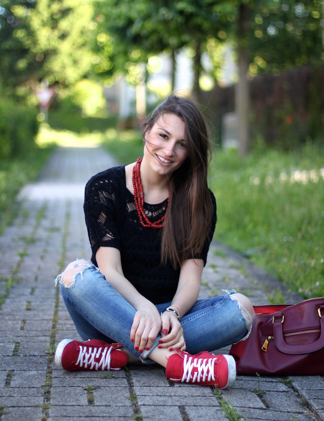 Questo è il look che ho utilizzato domenica sera per una cena casual con amiche: top in pizzo preso a Londra mesi fa ma che ancora non avevo potuto indossare a causa delle temperature, i miei soliti jeans (vi stavate preoccupando eh che non li mettevo più?) , collana e scarpe rosse e occhiali con dettagli verde chiaro (devo avere una maledizione perchè come il bracciale di Furla anche questi si sono rotti ieri sigh…).
