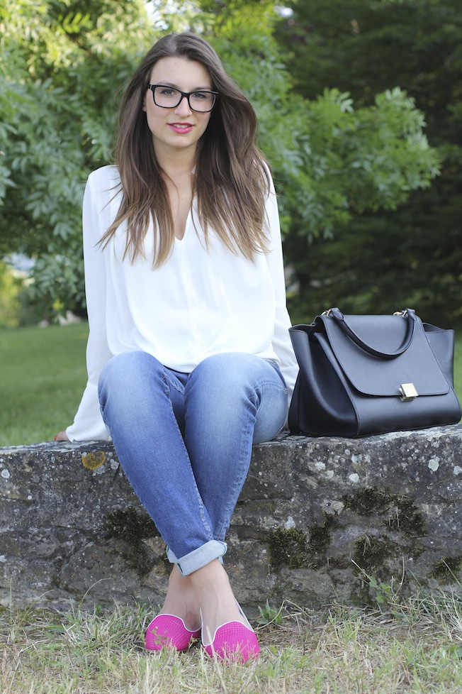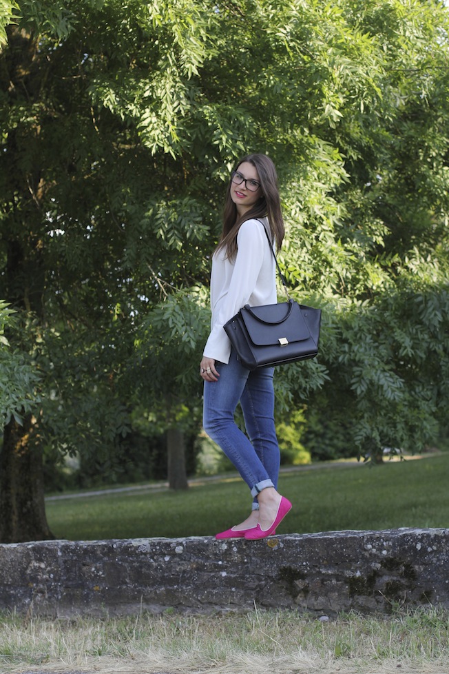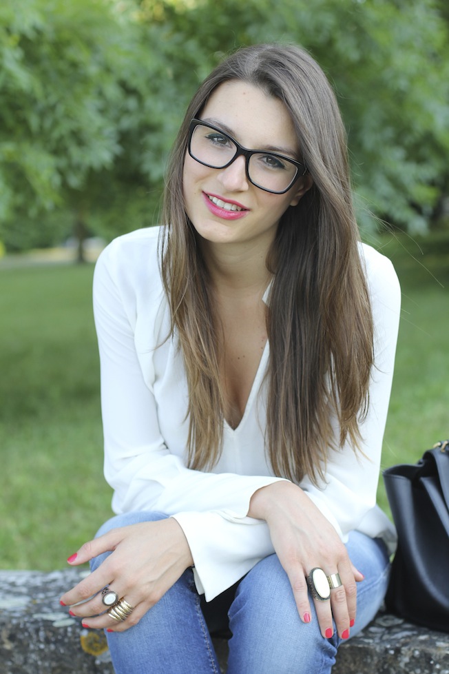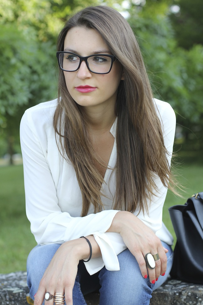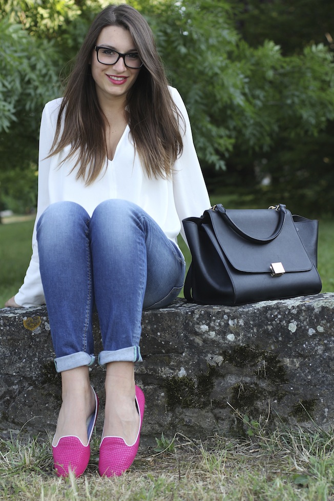 Ma veniamo al look di oggi, ho indossato questo outfit per alcuni appuntamenti di lavoro in città la scorsa settimana. Per gli appuntamenti di lavoro opto sempre per look semplici, puliti ed eleganti, ma con un tocco di colore che non passi inosservato! Questa volta ho scelto una blusa bianca di Zara che ho abbinato a un paio di jeans del brand Maison Clochard di cui mi sono davvero innamorata, sono comodissimi, vestono alla perfezione e risaltano le forme ( e voi sapete bene quanto io abbia un problema a indossare i jeans!!). Il tocco di colore l’hanno dato le mie nuove e super comode slippers di Charles Philip che hanno all’interno una suoletta ergonomica che aiuta a camminare con scarpe rasoterra.
