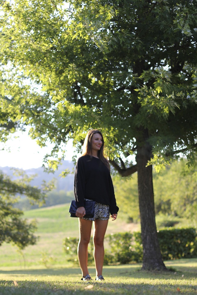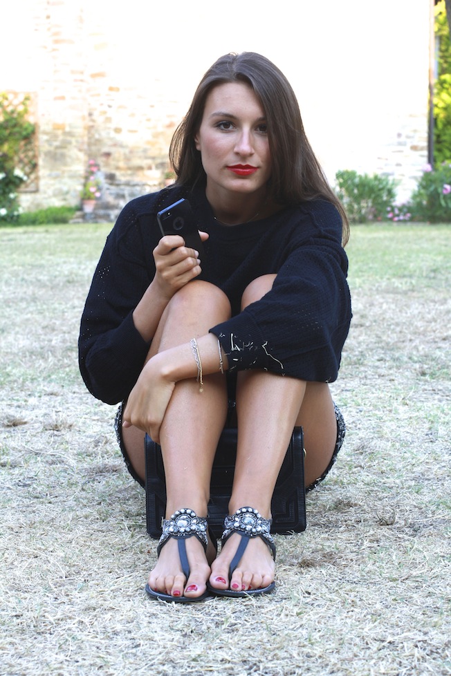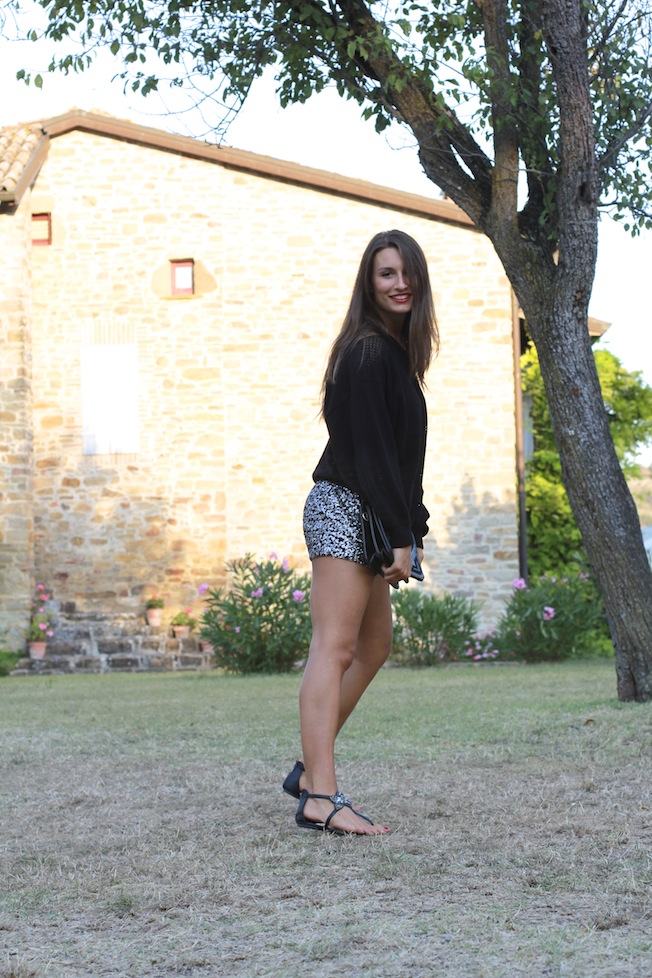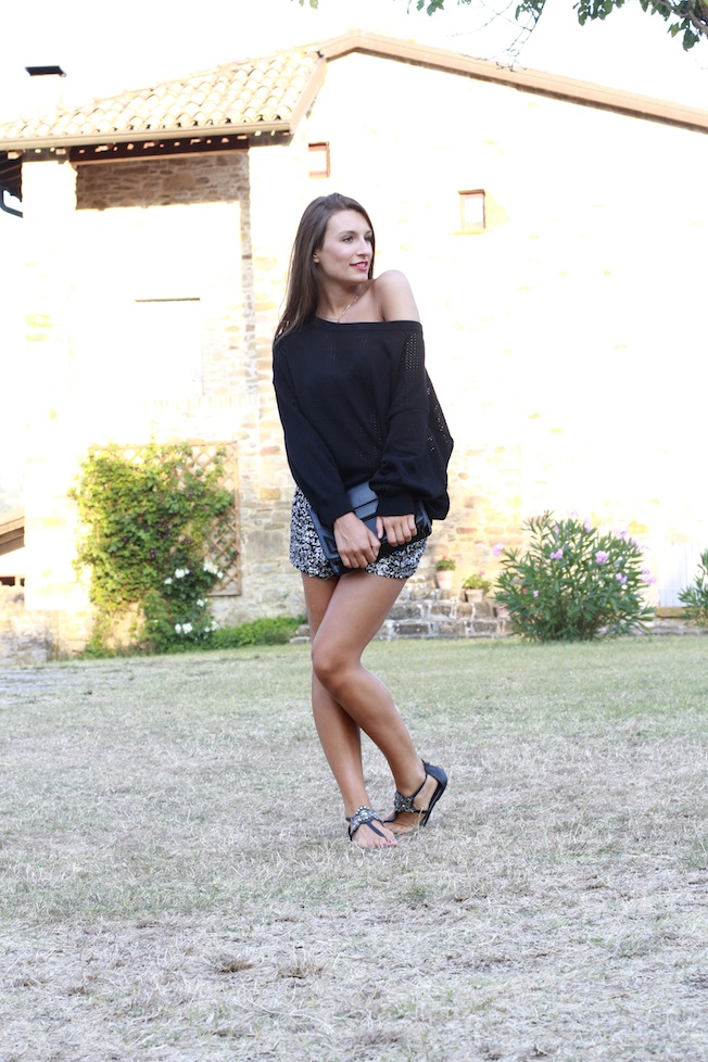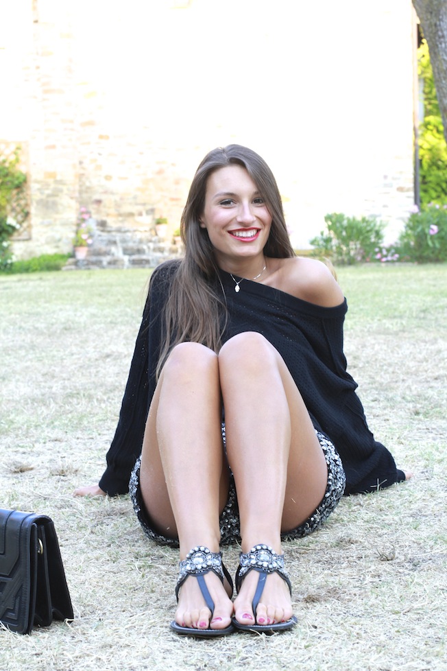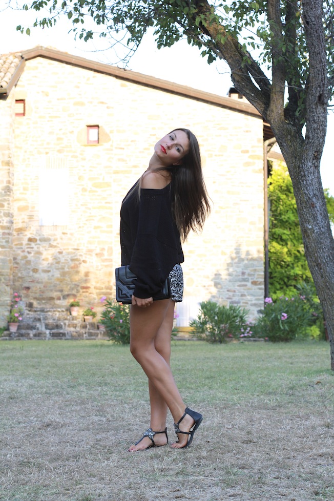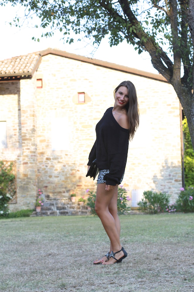Per oggi vi lascio queste foto scattate qualche giorno fa prima di andare a cena, faceva un po’ freddino così ho deciso di indossare questo maglioncino ampio e bucherellato che ha fatto il suo dovere tenendomi caldino, senza esagerare!Ho poi indossato i miei shorts in piallettes abbinati ai sandali gioiello e una pochette nera!