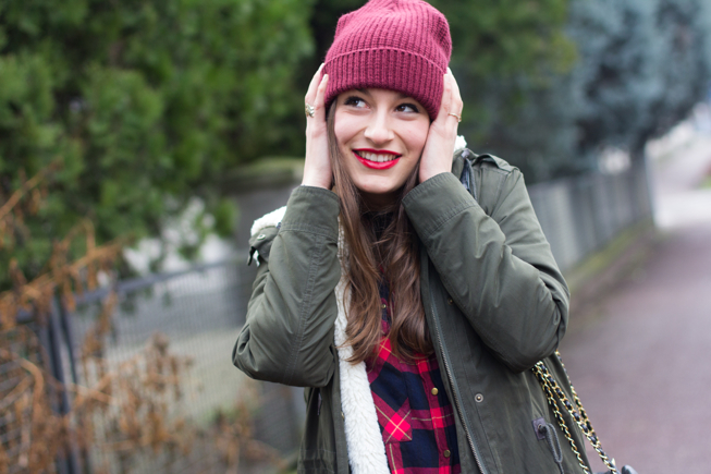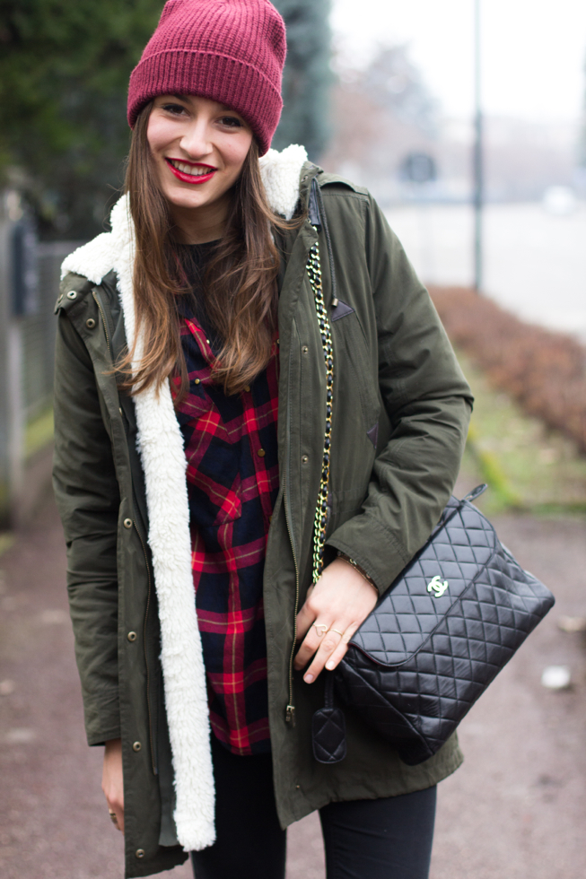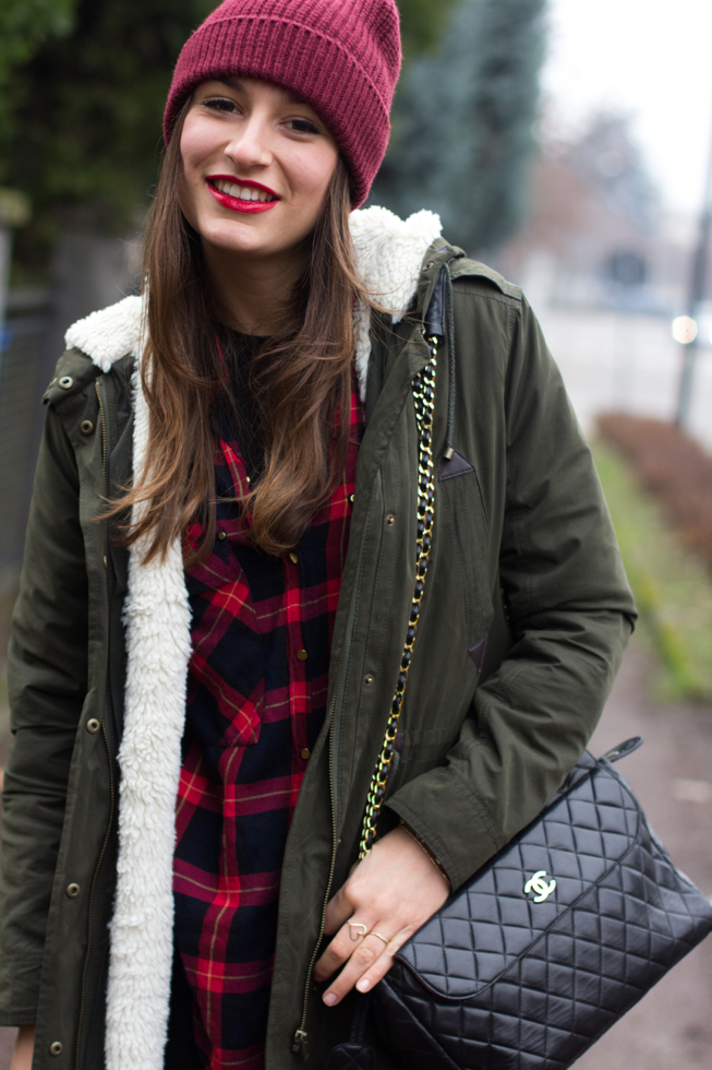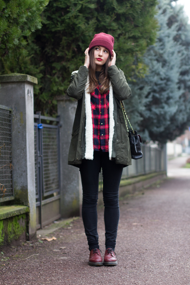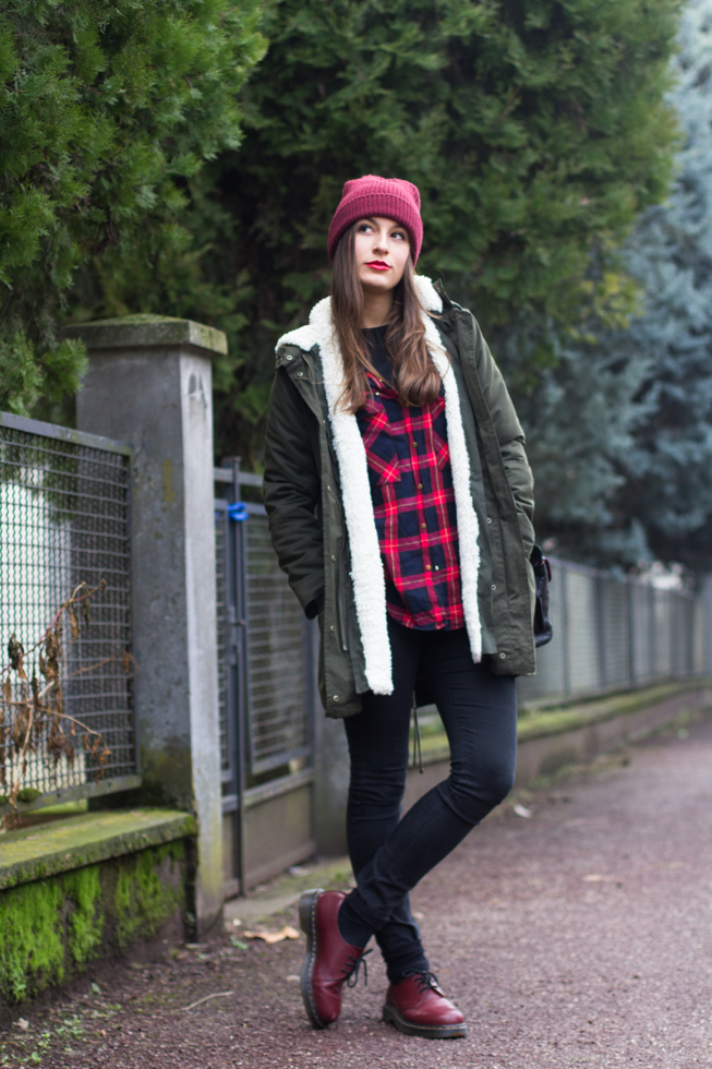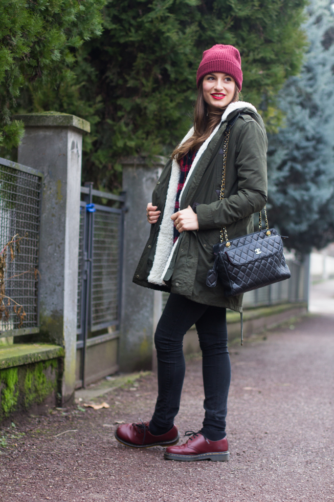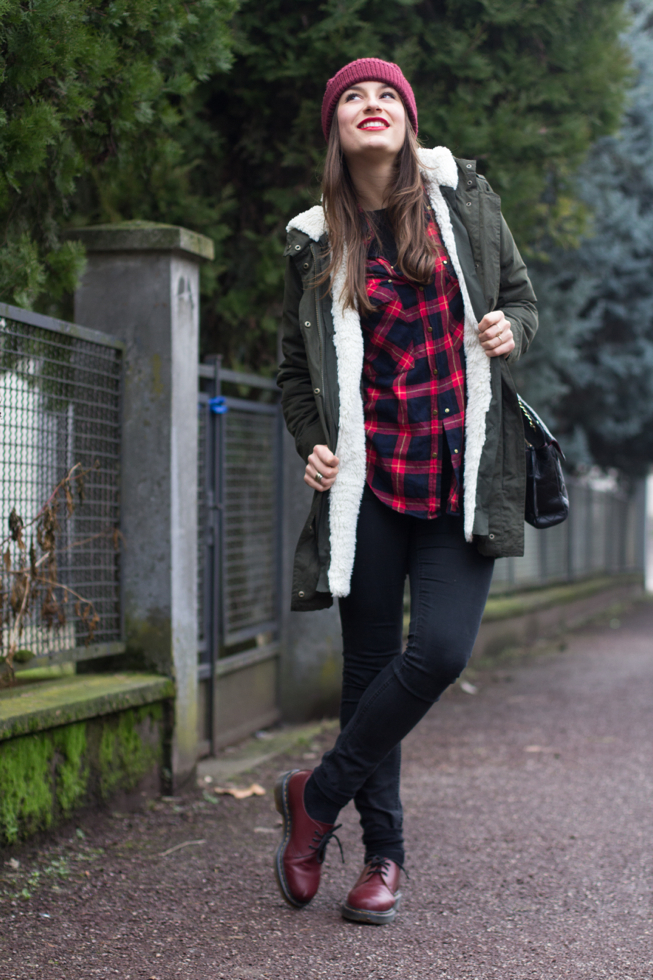 Ho quindi scelto una camicia tartan, un paio di skinny neri, le mie fedeli Dr Martens Cherry e un capellino che mi proteggesse dal freddo e dalla nebbia. Per completare il tutto ho poi aggiunto un tocco di rossetto rosso e la mia Chanel Vintage! That’s all! 🙂