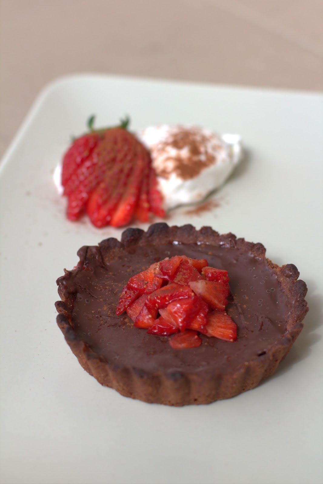 Una volta sfornate e raffreddate guarnitele con la salsina alle fragole. Con il cioccolato precedentemente sciolto con il burro rifinite le tortine creando uno strato di cioccolato sopra alle fragole. Mettete in frigo a far raffreddare.