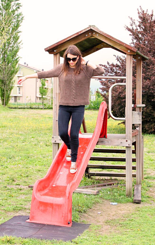 Hello! Here are some really unusual and funny pictures, just to change a little! I returned in a playground after so long and you can see that from the determined and safe movements and above all the speed and grace with which I go up the slide .. 😉 The look was obviously the most easymand sports, Zara sweater (you’ve already seen here), AllStar, colorful bracelets and black CheapMonday!