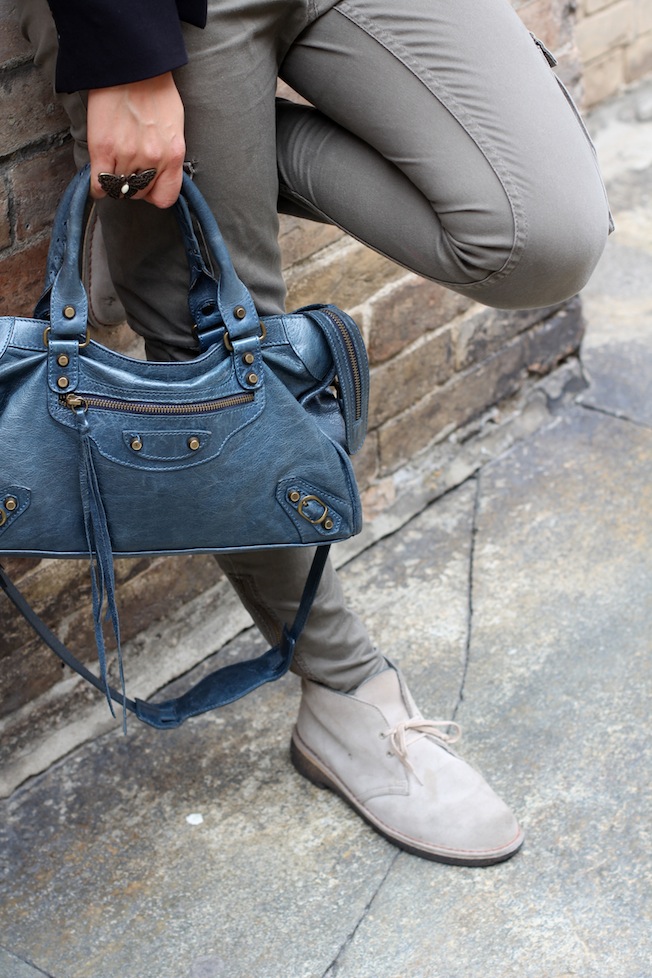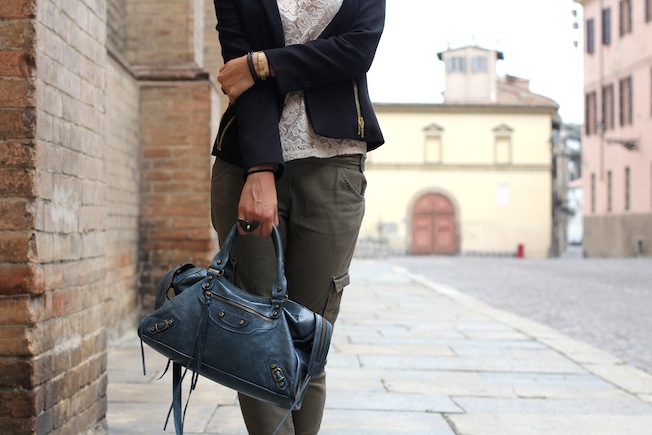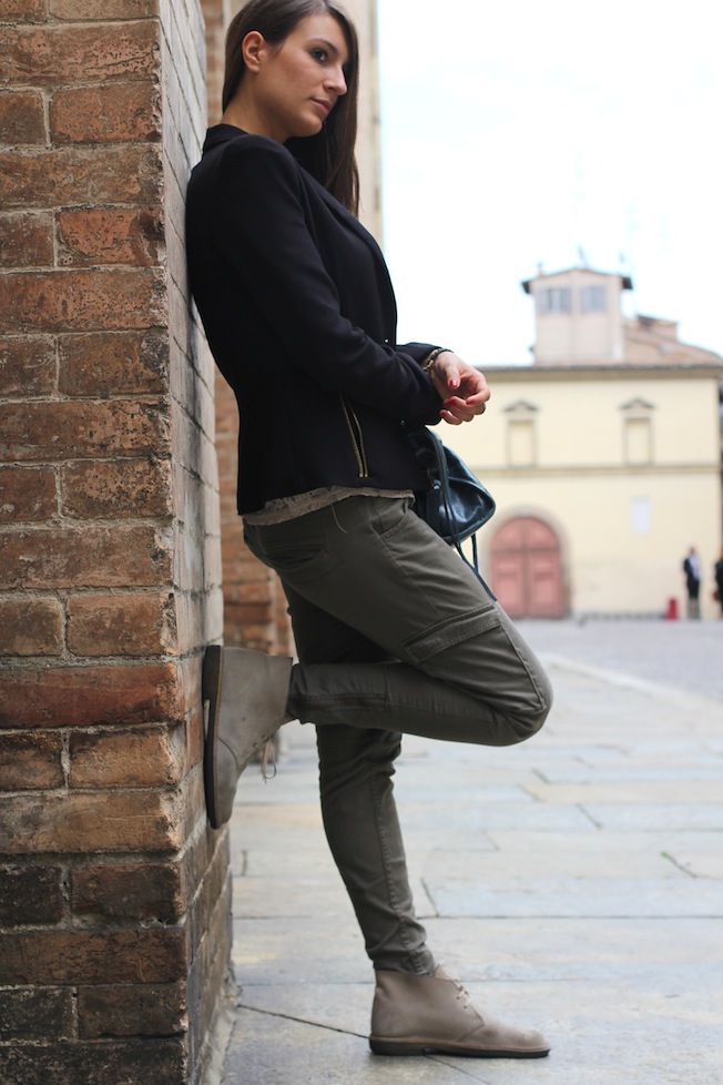 Ho indossato un paio di pantaloni militari presi da H&M, che ormai mi stanno abbastanza larghi purtroppo, la maglietta in pizzo che avete visto anche quest’estate e un nuovo blazer con spalline che mi piace molto!