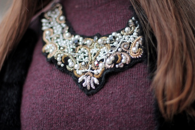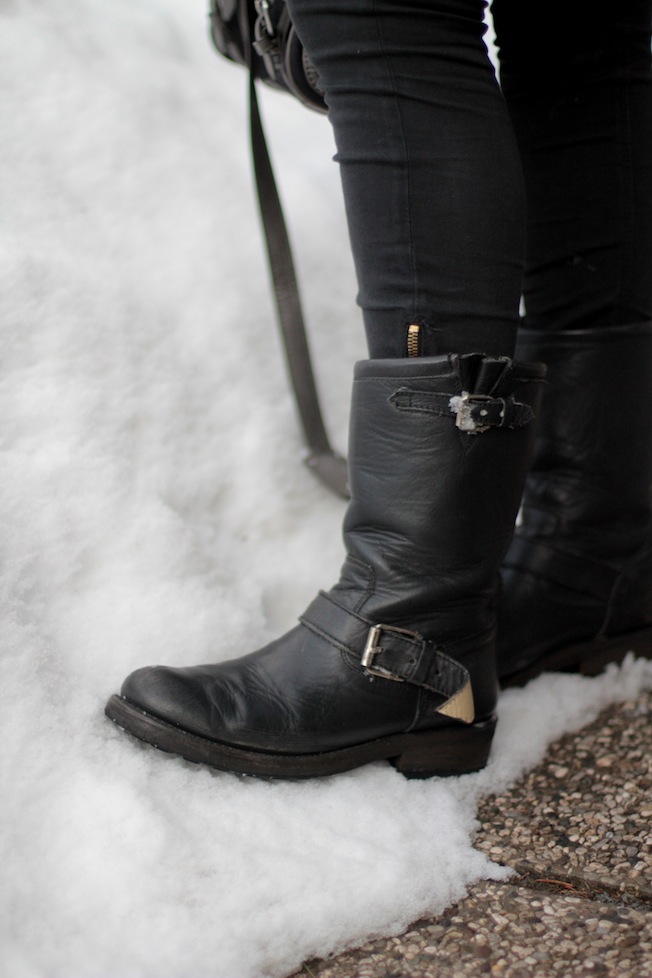 La prima sera per uscire a cena ho optato per un look adatto al clima e alla neve: biker boots, jeans (con sotto le calze termiche), maglione ampio e pelliccia finta. Per impreziosire il tutto ho puntato sugli accessori: cappellino a contrasto color menta e collana gioiello. La borsa è l’unica che ho portato per me qui in montagna: pratica, capiente e comoda, mi è stata prestata da mia sorella!
