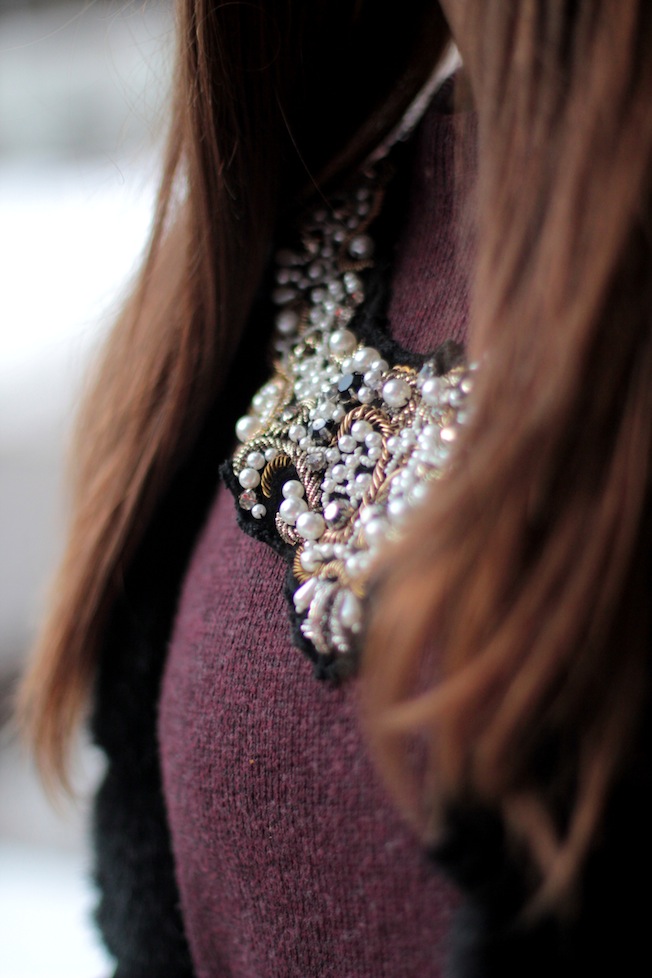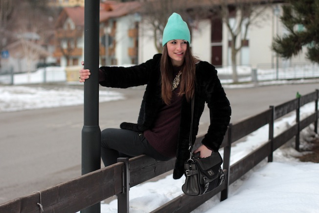 The first night to go out for dinner I chose a look suited to the climate and snow: biker boots, jeans (with thermo socks), large sweater and fake fur. To embellish everything I focused on accessories: mint hat and jewel necklace. The bag is the only one I brought with me here in the mountains: practical, spacious and comfortable, I’ve stolen it from my sister!
