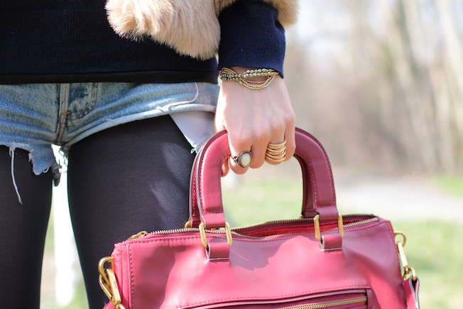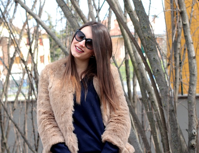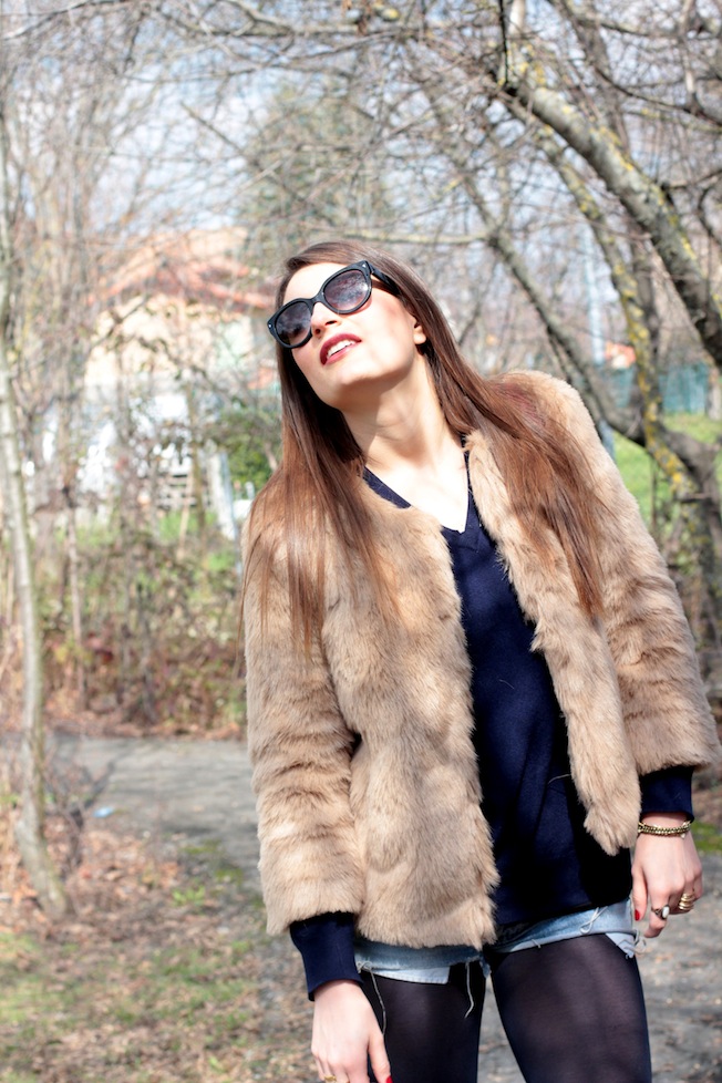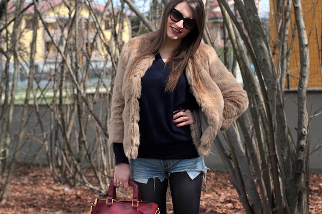 Oltre ai collant blu e al maglione ampio dello stesso colore ho poi abbinato i miei amati short di Levi’s, la pellicciotta beige perfetta per questi ultimi freddi e gli stivaletti di H&M che sono sempre super comodi!