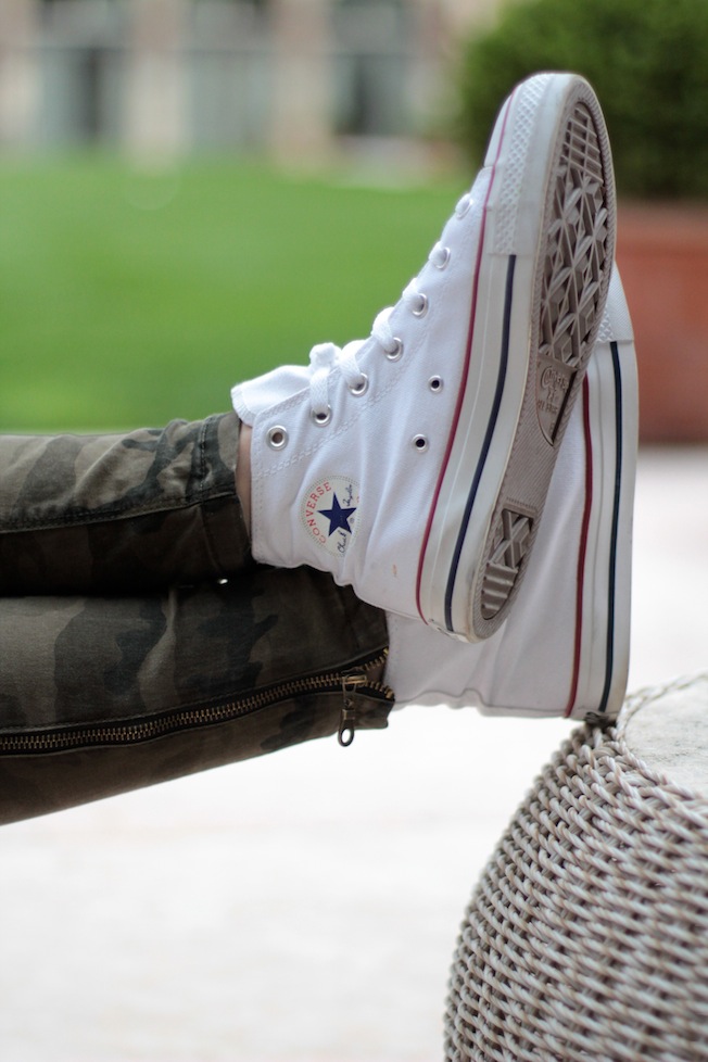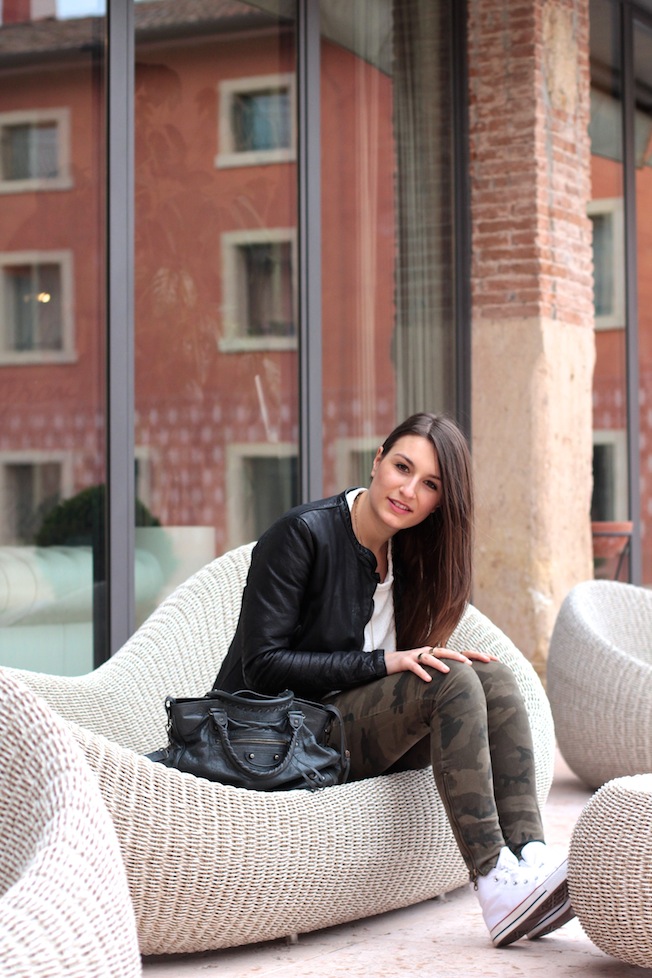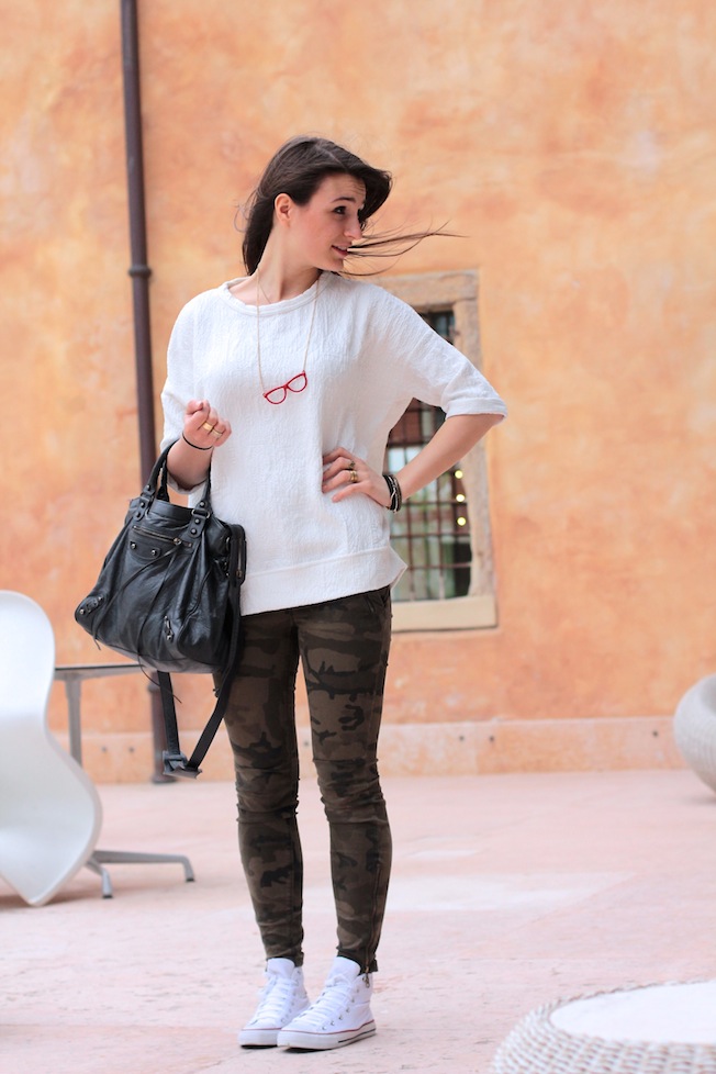 Nelle foto, scattate nelle uniche ore di sole del weekend vedete il mio outfit utilizzato sabato mattina per il viaggio, a me il mix tra bianco, camouflage e nero è piaciuto molto e mi ha fatto pensare a una valida alternativa estiva per questo look che anche a voi era piaciuto molto! Che ne pensate?