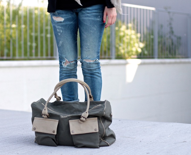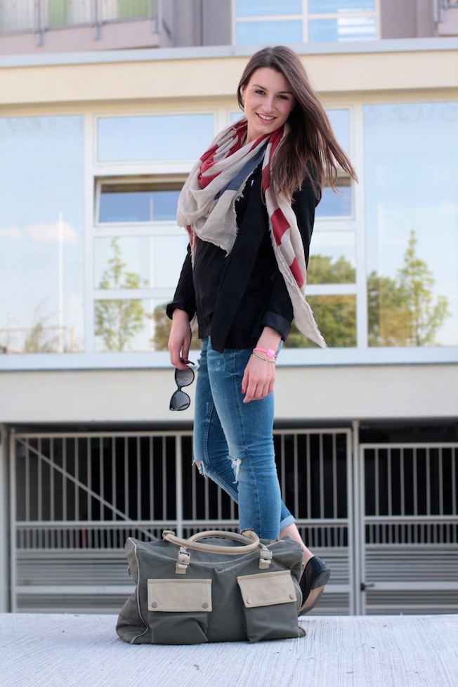 Spesso molte di voi mi chiedono che look utilizzo per andare in università, solitamente opto per look molto semplici (felpa+jeans, maglione+ jeans ecc) perché la mattina presto ho poca fantasia ma sopratutto perché ci tengo ad avere look molto sobri quando sono in università. Martedì, però, avevo un look un po’ diverso dal solito e così, questa volta, ho deciso di scattare per il blog il mio look appena uscita da lezione. Indossavo i miei jeans preferiti del momento, una tshirt basic, una giacca destrutturata di H&M, ballerine semplici e una sciarpa per arricchire il tutto! Per portare con me libri, appunti, Mac e tutto il necessario da un po’ di tempo a questa parte uso il borsone di Severe Gusts Italy che si è rivelato proprio l’accessorio perfetto per me!