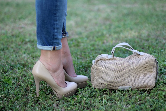 Here’s a new look! Finally, after keeping her in the closet for months and months, I was able to bring out my beautiful jute bag by Baba Crifer. I chose to combined it with a look in warm tones. I wore my beloved super ripped jeans and maix them with a lace top from H & M, beige décolleté, red lipstick and a soft braid!