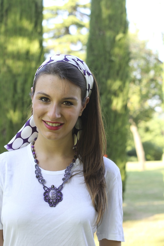 Il palio ci sono questo fantastico foulard di Brian Dales perfetto per rallegrare un look estivo, per essere annodato alla vostra borsa preferita o per essere utilizzato come fascia tra i capelli e questa bellissima collana abbinata vintage, perfetta per dare un tocco in più a un look total white.