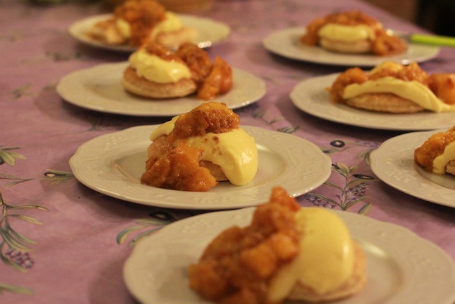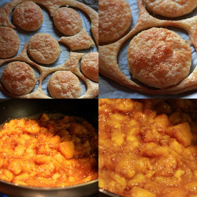 Per prima cosa mettete una punta di crema sul piatto e adagiarvi sopra un disco di pasta sfoglia ( permetterà al dolce di essere più stabile sul piatto). Sopra alla sfoglia mettere una generosa cucchiaiata di crema e per completare un’altra cucchiaiata di composta di pesche e amaretti. Et voilà !! Il dolce è pronto per essere mangiato !!!