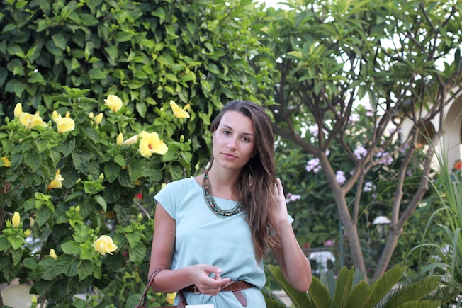 Questo è l’ultimo look che ho indossato (e fotografato) in Sicilia a San Vito lo Capo. Il protagonista assoluto del look è questo splendido abito turchese di Minimum caratterizzato da una forma molto semplice e portabile e da sovrapposizioni di tessuto e trasparenze che lo rendono unico!