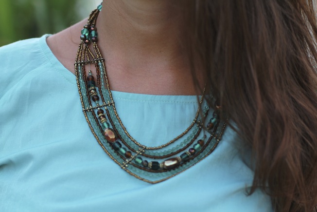 Ho deciso di reinterpretarlo in chiave vintage abbinandolo ad alcuni accessori della mia amica Eleonora:una cintura in pelle, collana sui toni del turchese e del marrone e Longchamp bianca e cuoio. Che ne pensate?