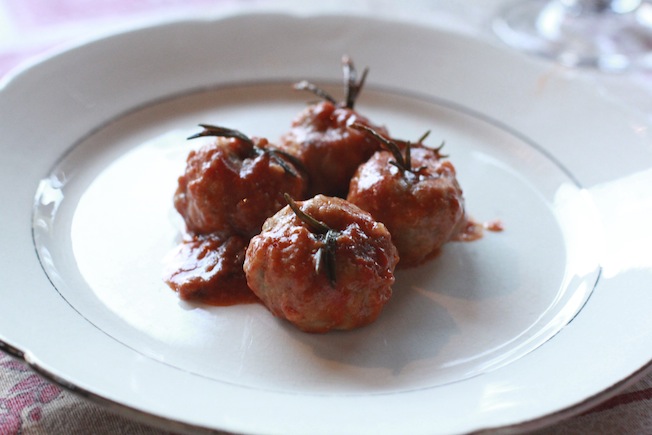 Mescolate il macinato con il pan grattato, il formaggio, le due uova il sale e la noce moscata. Quando l’impasto è omogeneo formate con le mani delle piccole palline, infarinatele e poi inserite un rametto di rosmarino e un piccolo pezzetto di aglio in ogni polpetta (vedi foto).