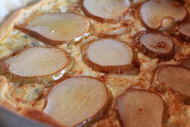 Stendete il rotolo di pasta sfoglia in una teglia, bucherellatelo con una forchetta e ricopritelo con il mix di gorgonzola e mascarpone in modo uniforme. Tagliate le pere a fette (come nel mio caso) o a spicchi e adagiatele sul composto omogeneamente.