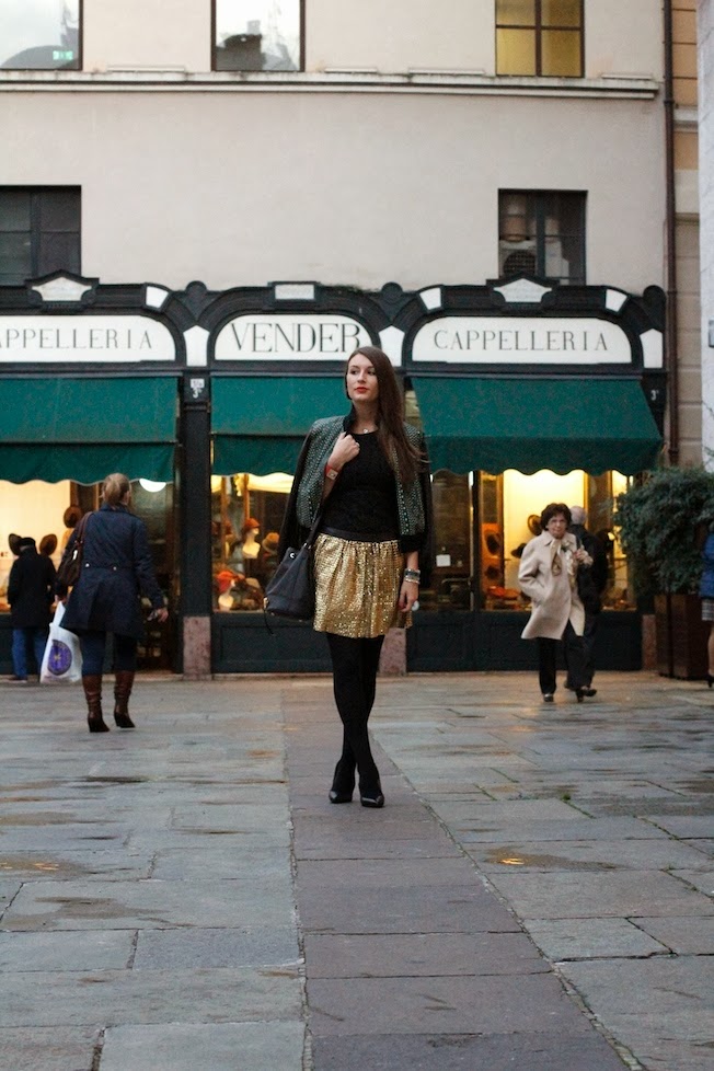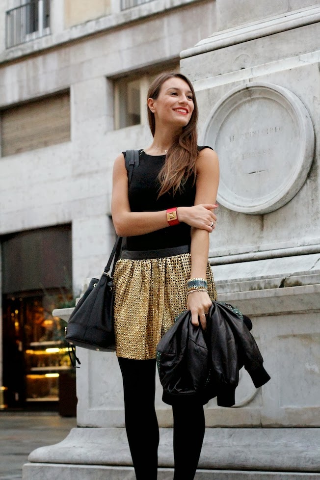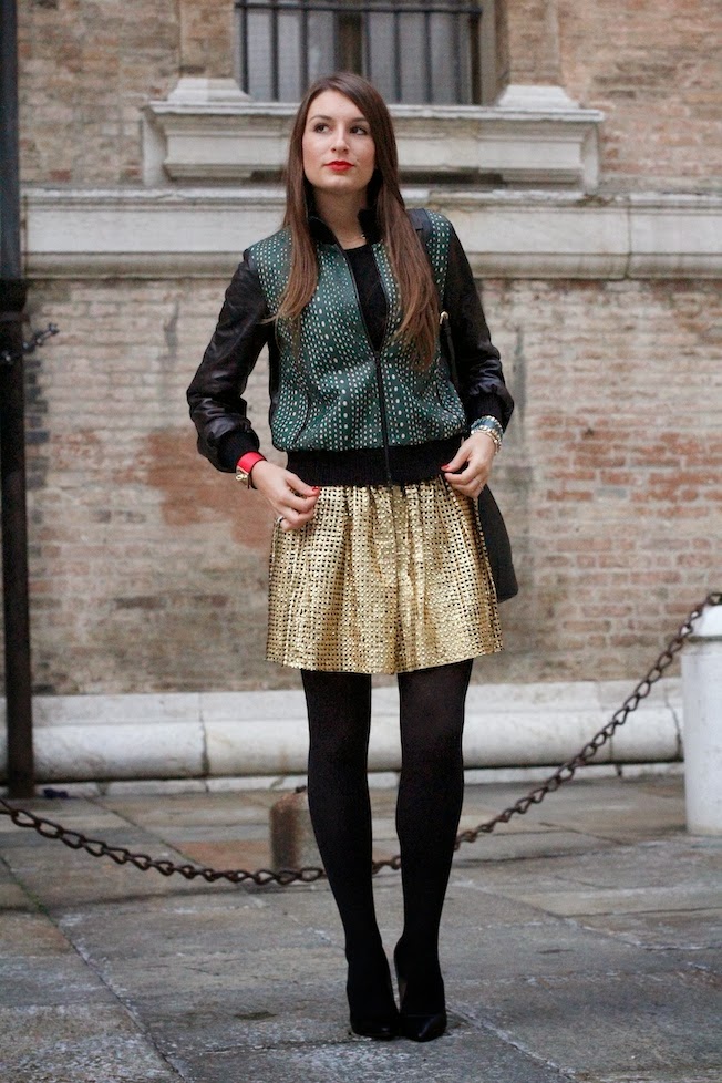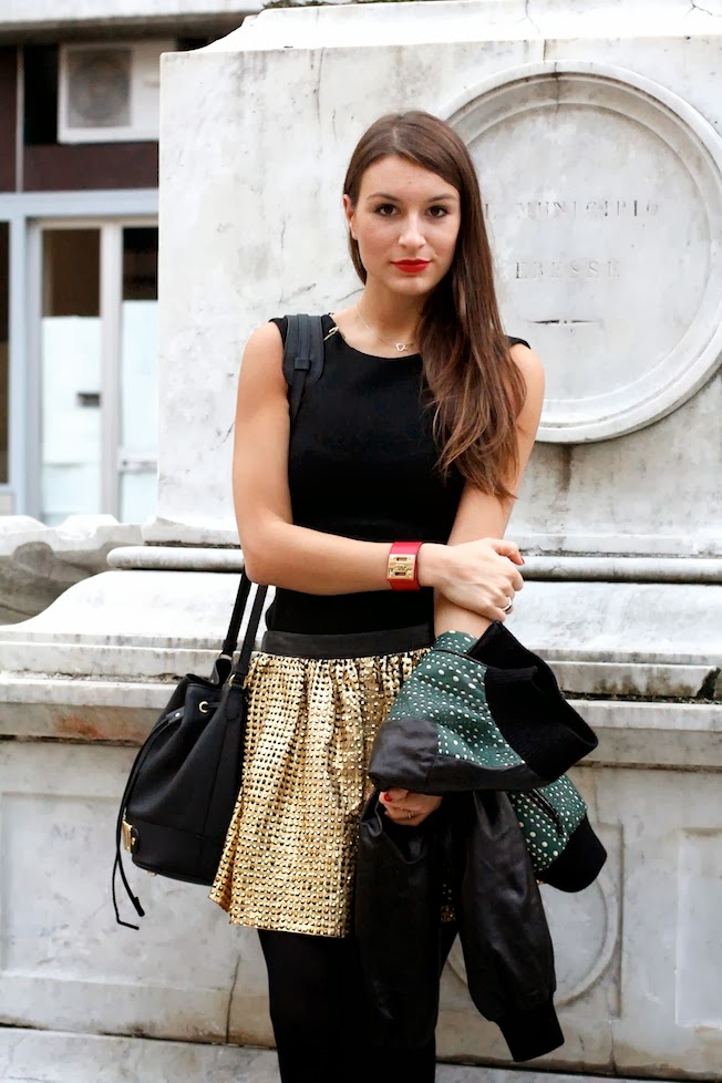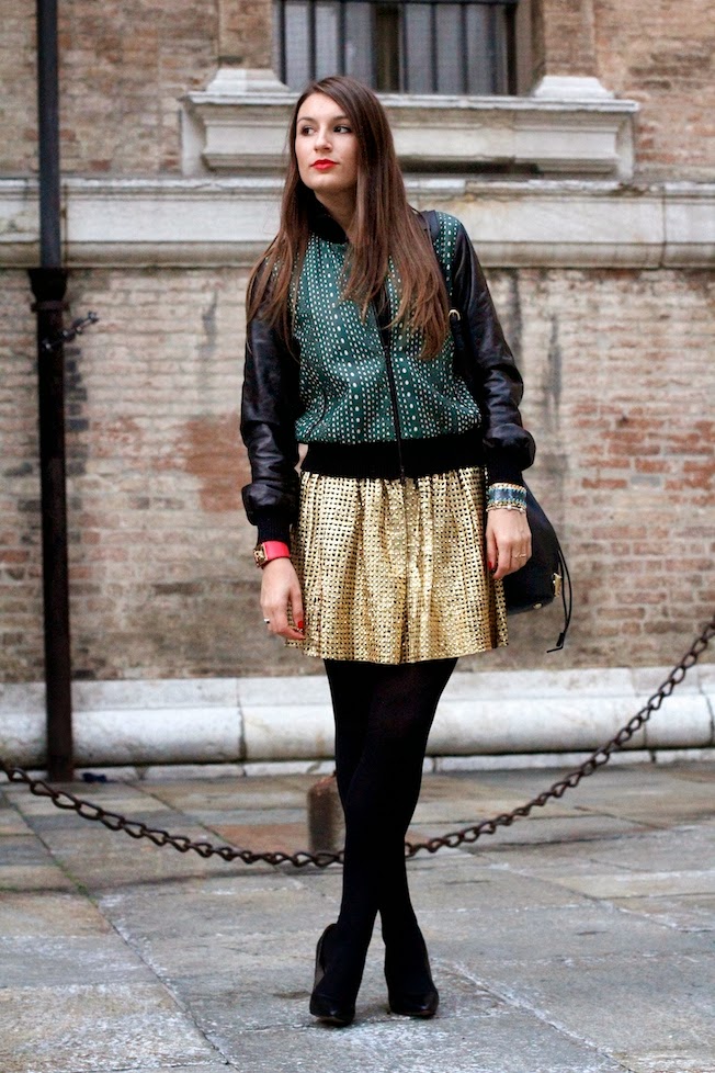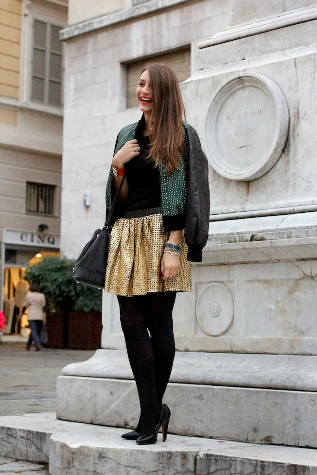 That’s the look that I used yesterday to attend the CupCakeDay event organized by Coccinelle in Parma! I chose to wear a total leather look by DROMe, an italian brand that creates high quality leather clothes, suitable for the day and for the night. I match a golden skirt carved by laser with a dark green leather jacket (so soft..) also characterized by the same pattern laser!