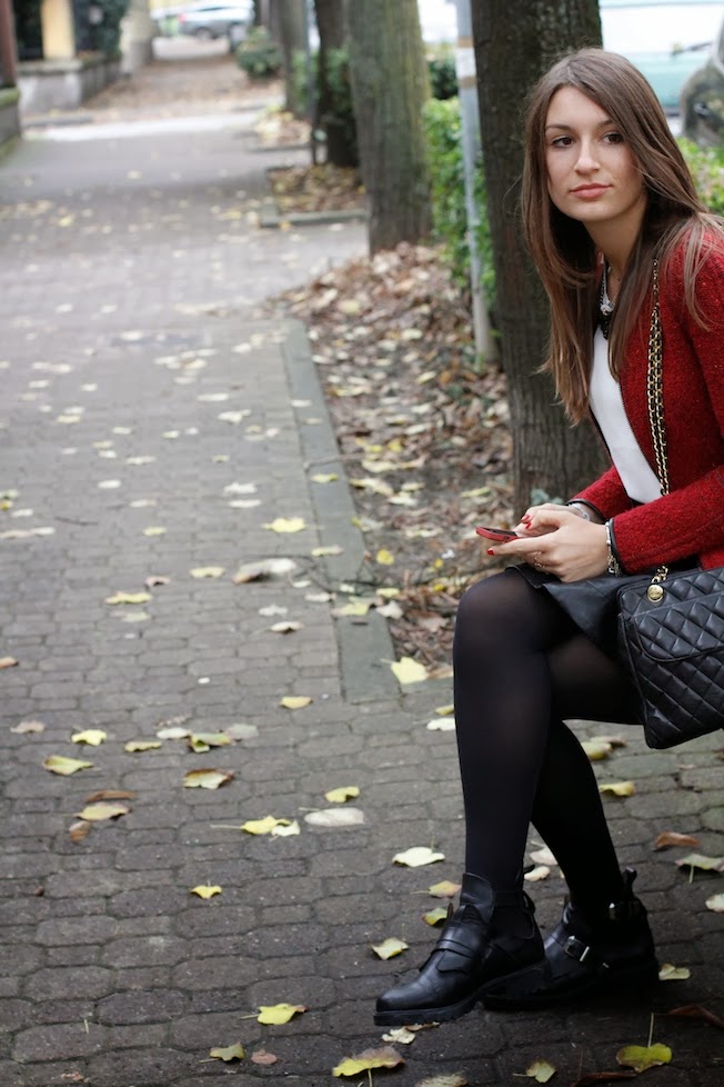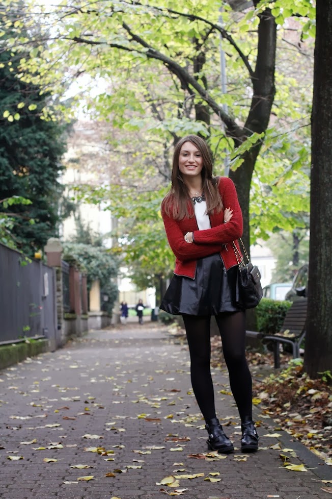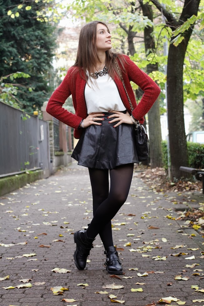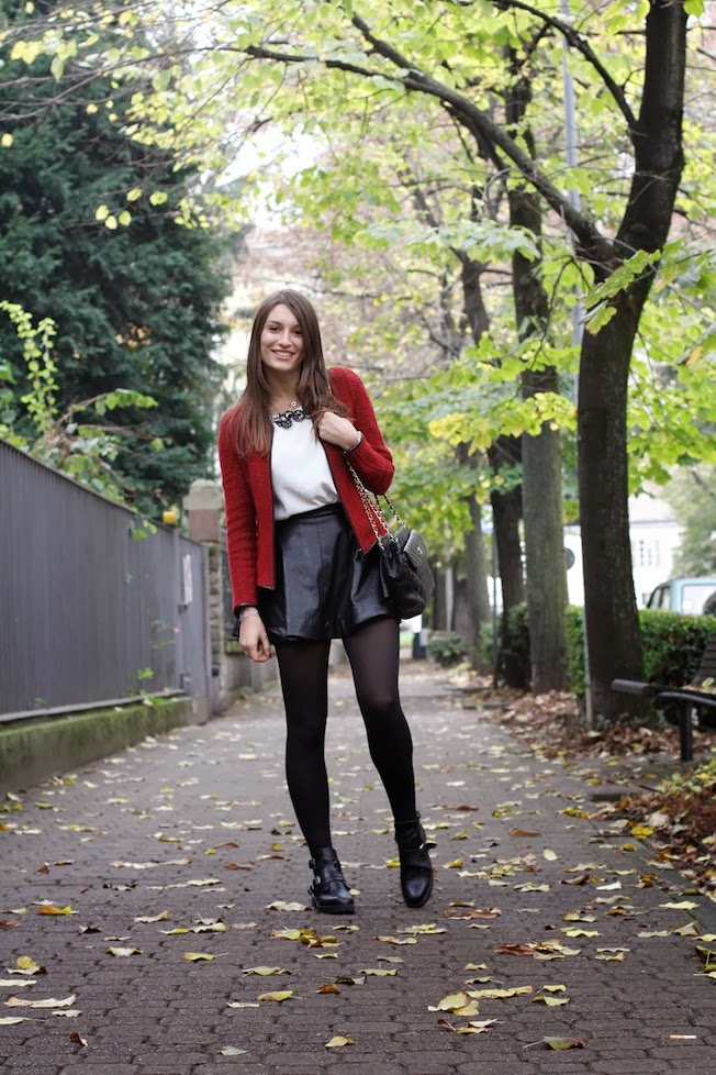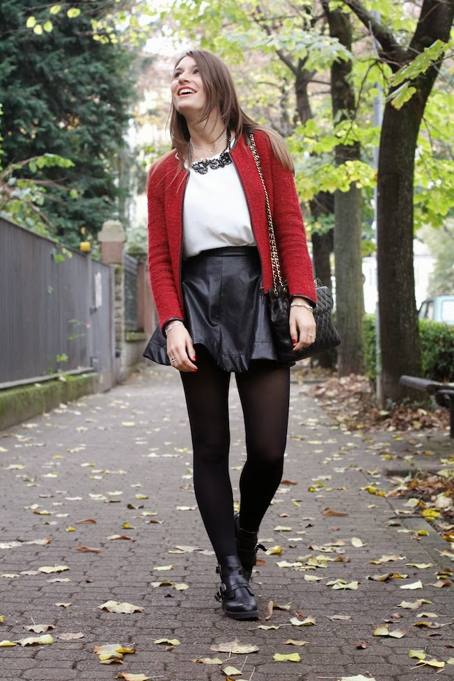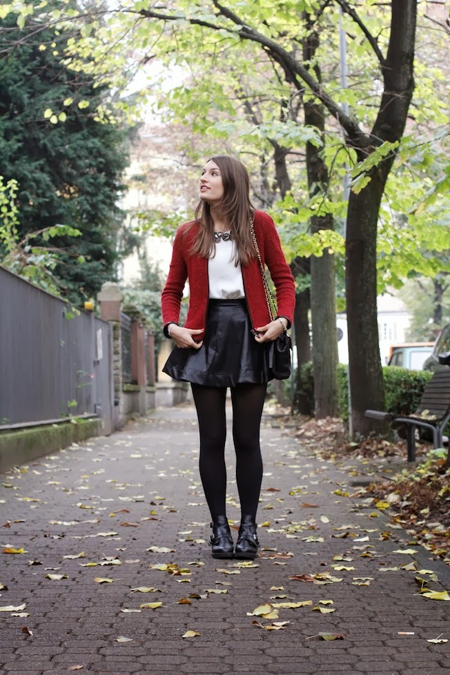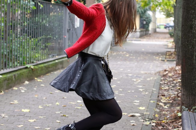 Mentre sto ancora decidendo cosa indossare vi lascio le foto del look che ho indossato l’altra sera per un aperitivo con gli amici: gonna a ruota in pelle (l’avevate già vista Qui), camicetta bianca, giacca rossa in lana e i miei boots preferiti di Zara!