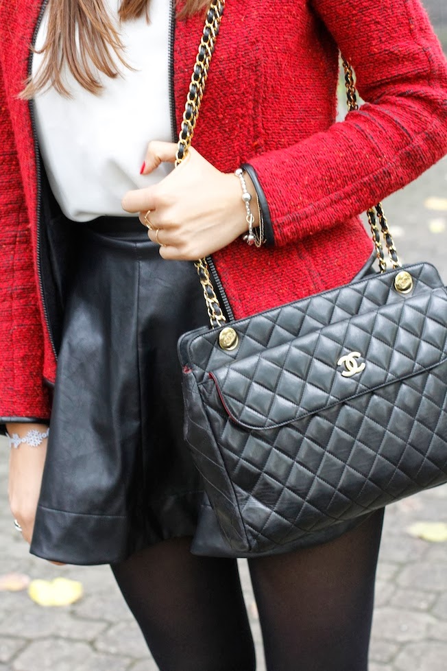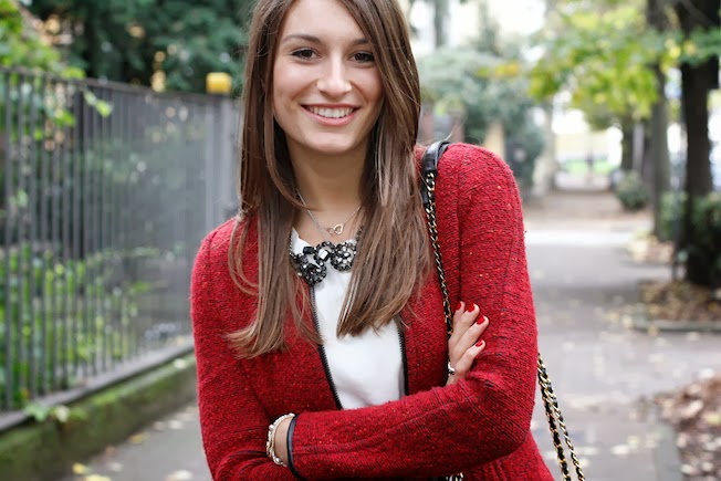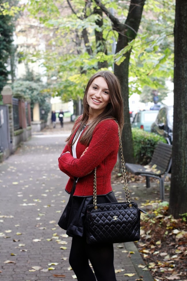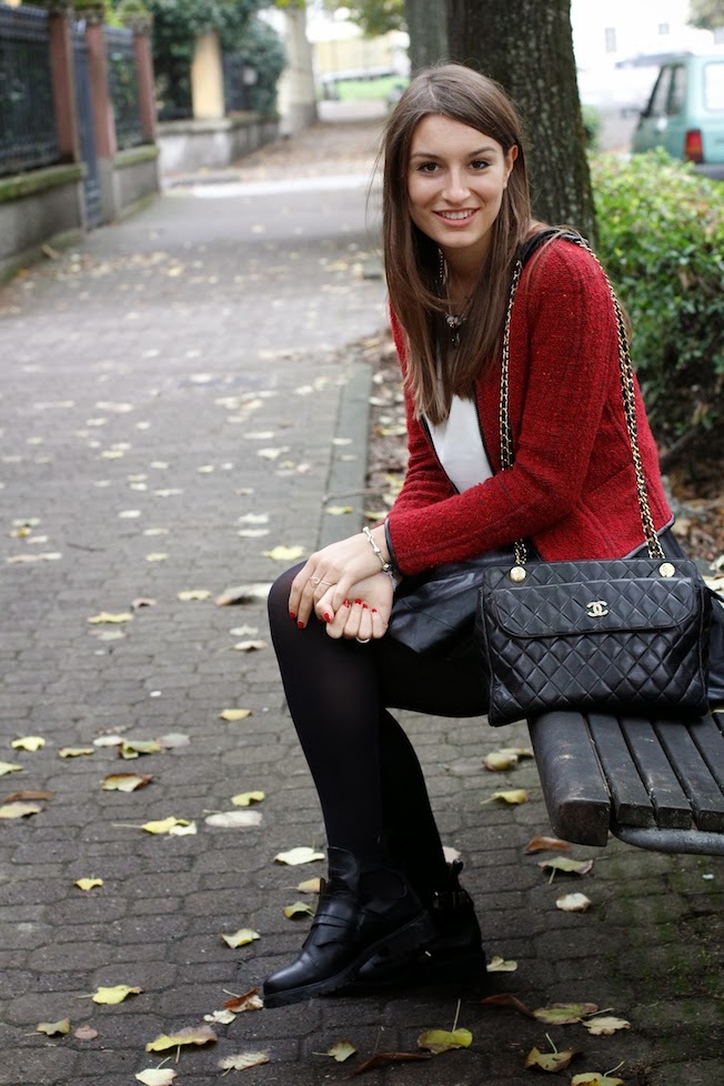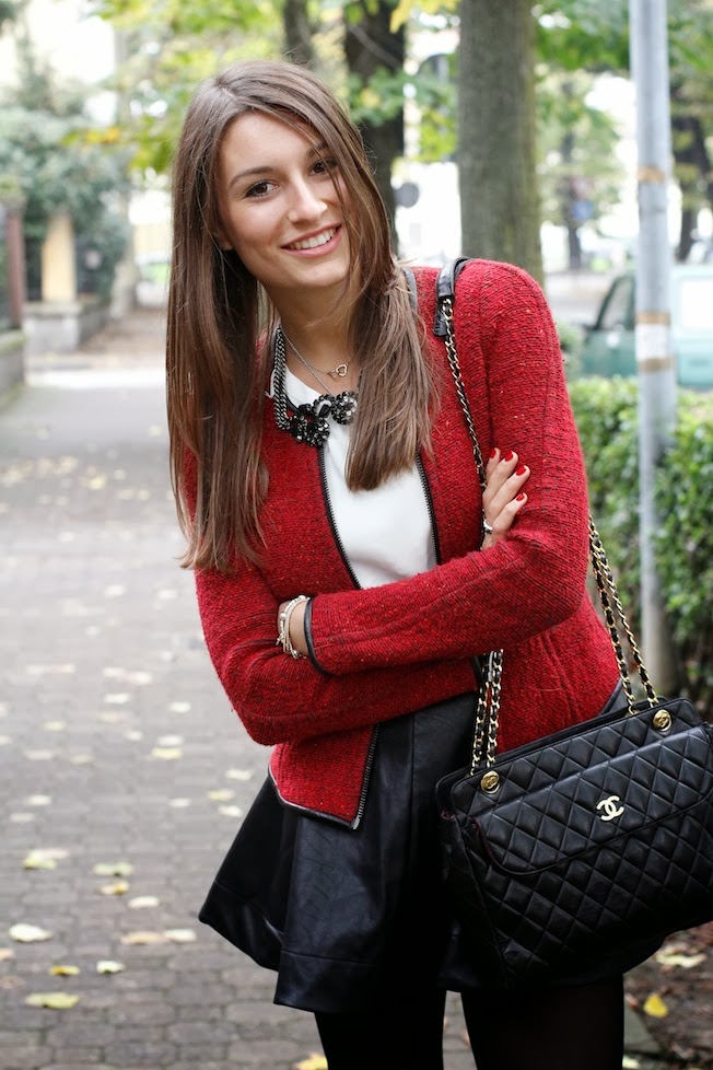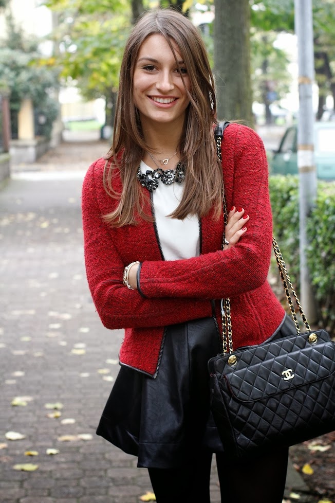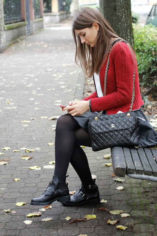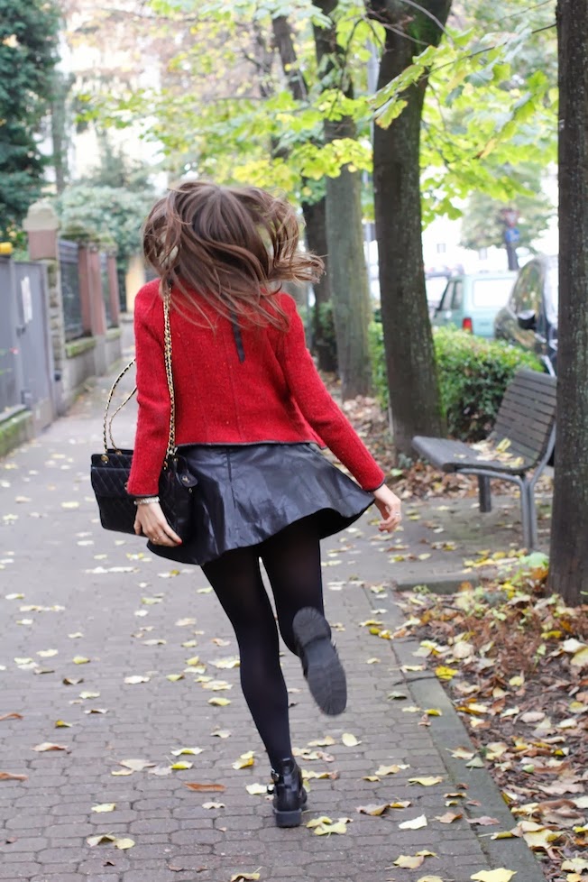Mentre sto ancora decidendo cosa indossare vi lascio le foto del look che ho indossato l’altra sera per un aperitivo con gli amici: gonna a ruota in pelle (l’avevate già vista Qui), camicetta bianca, giacca rossa in lana e i miei boots preferiti di Zara!