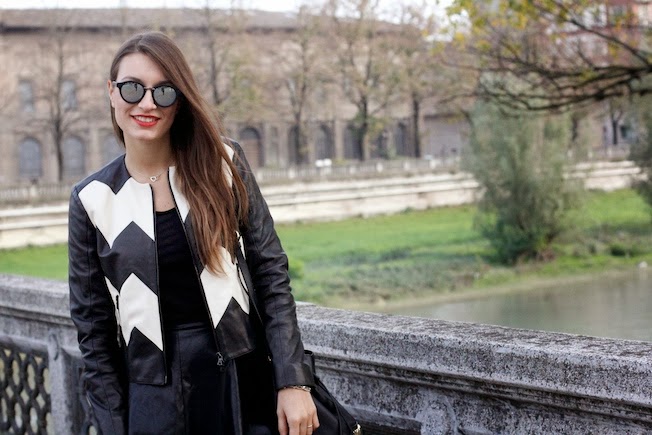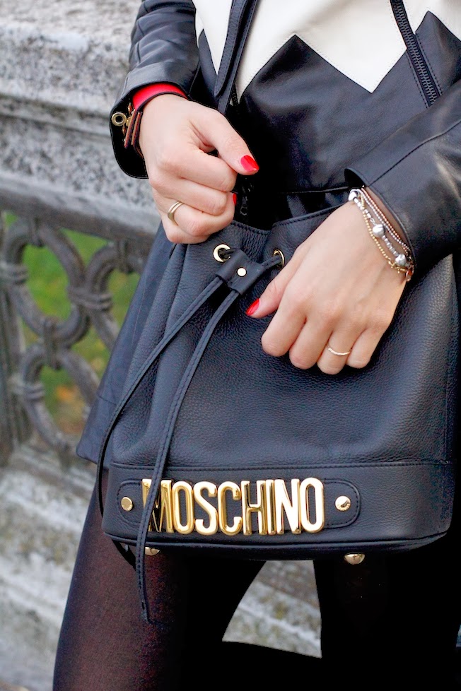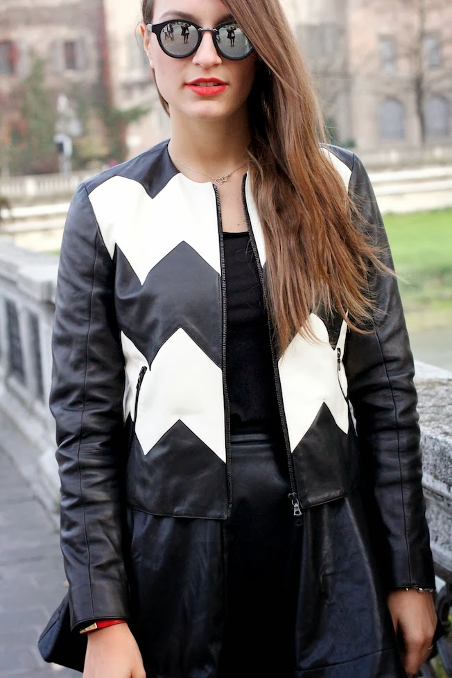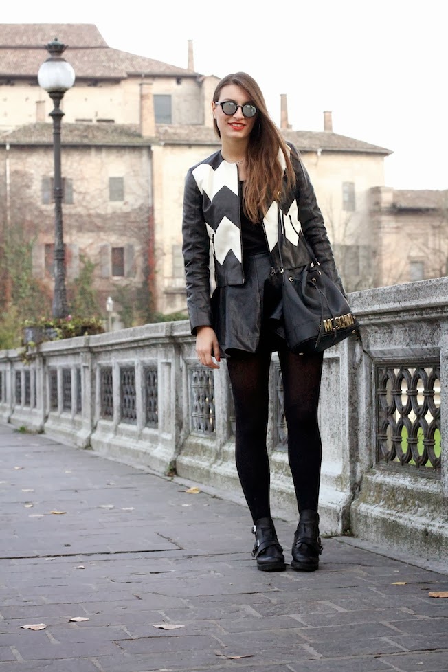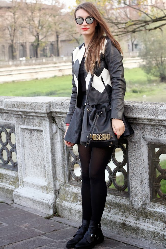 Ho deciso di abbinare questa splendida giacca a una gonnellina in pelle a ruota, stivaletti Zara, occhiali specchiati e la mia nuova borsa Moschino che ormai è sempre con me!