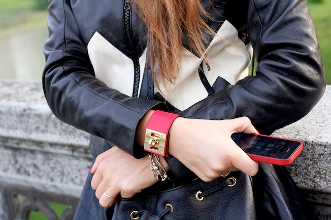 I decided to combine this beautiful jacket with a leather skirt, Zara boots, mirrored sunglasses and my new Moschino bag that is always with me now!