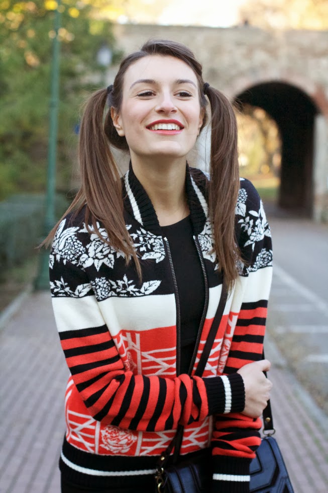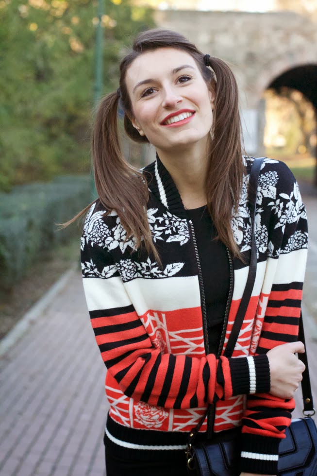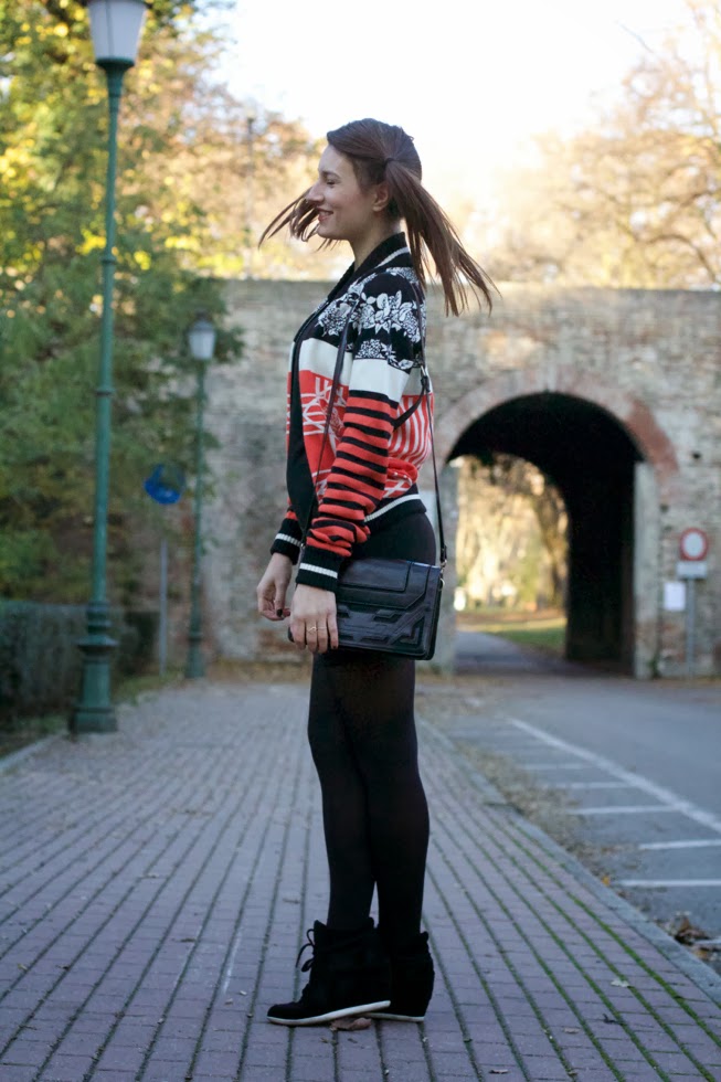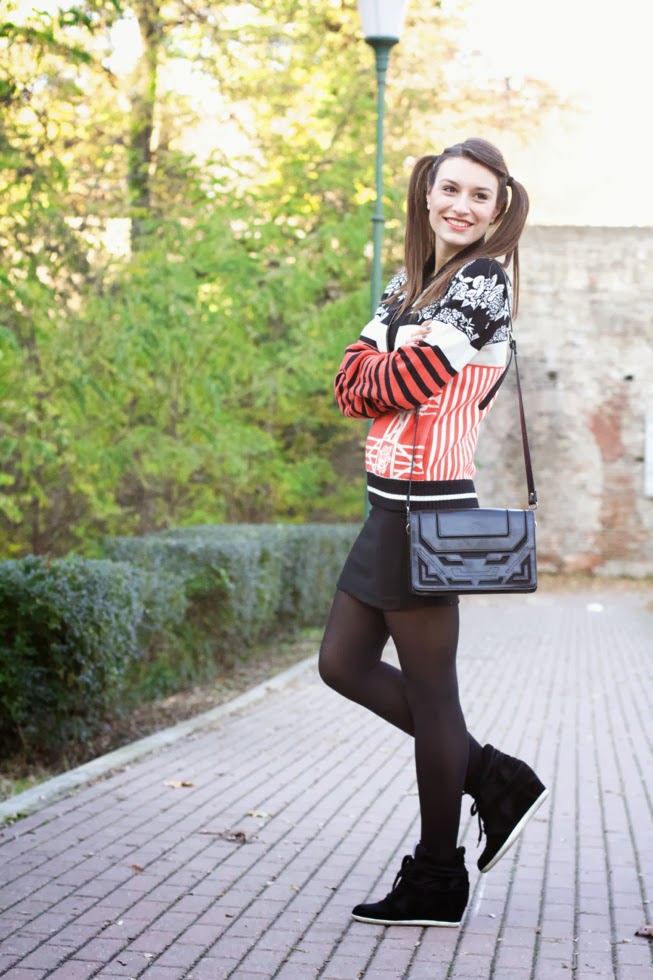 Ho abbinato quindi al bomber un tubino nero elegante, un paio di sneakers con zeppa, una piccola borsa a tracolla e un paio di codini da Pippi Calzelunghe! 🙂