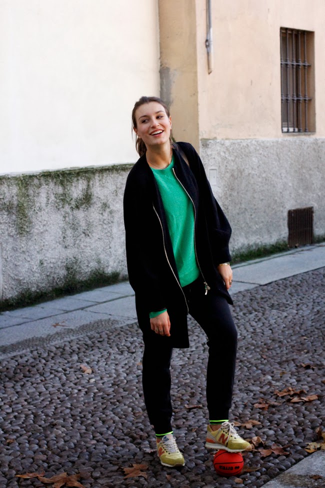 Ho deciso di abbinarli ad un look easy chic composto da New Balance gialle, maglione verde fluo preso a Londra l’anno scorso e accessori un po’ più eleganti quali il cappotto e la borsa!