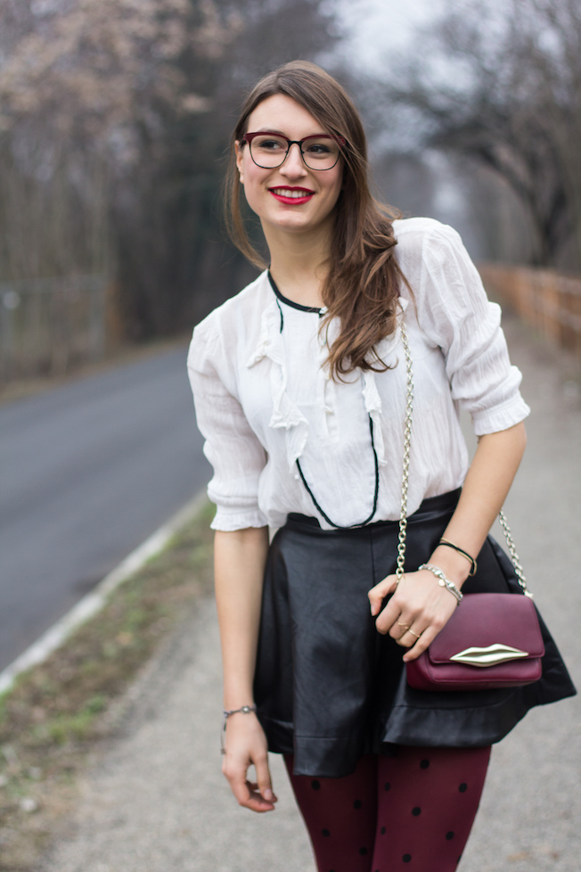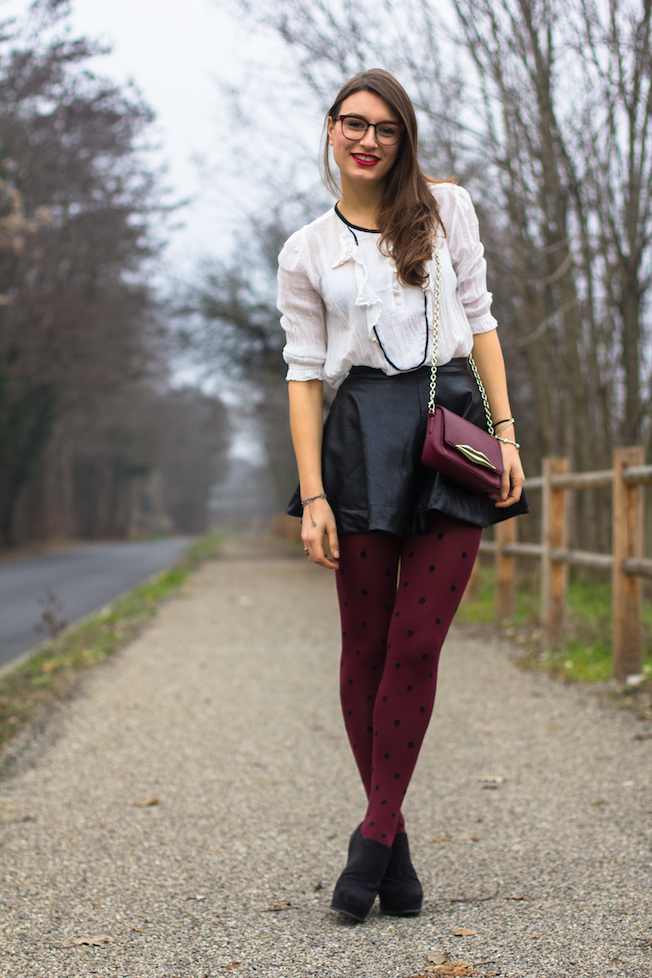 Ho scelto di abbinare queste splendide calze bordeaux a pois prese da Calzedonia a un look un po’ bon ton caratterizzato dalla gonna a ruota in pelle, da una camicetta un po’ maschile, occhiali da vista nuovi e borsa a tracolla di Diane Von Furstenberg perfettamente coordinata alle calze!