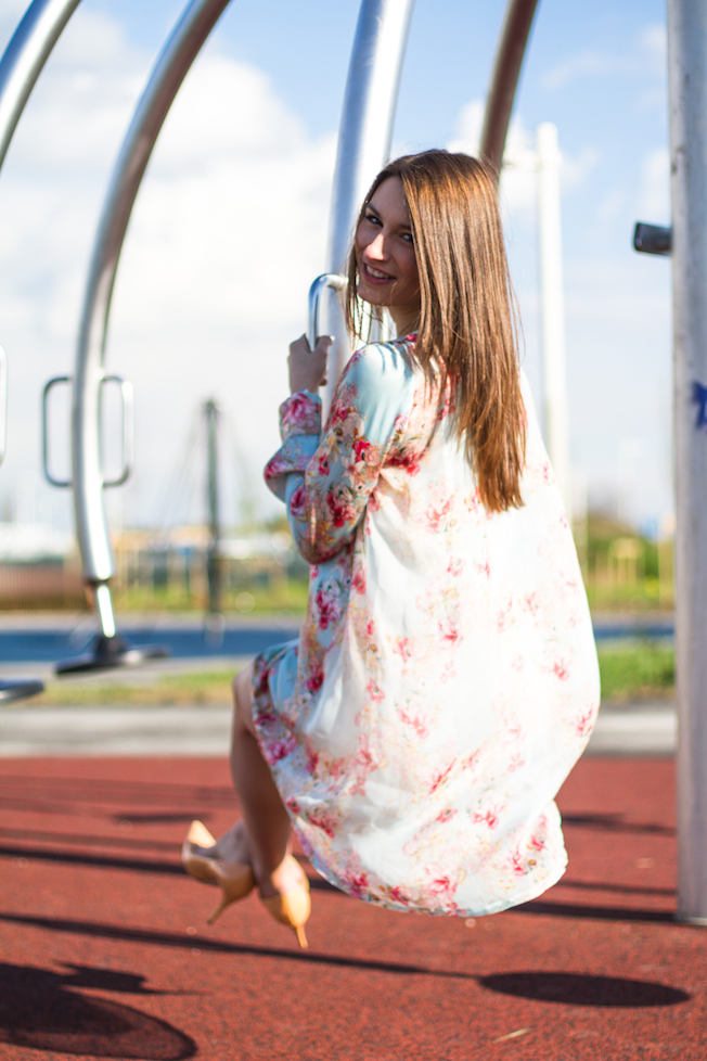Ho scelto di abbinarlo ad un paio di semplici decolletè in vernice arancioni che lo rendessero perfetto anche per una delle tanto frequenti cerimonie primaverili e ho scattato le foto in un parcogiochi vicino casa mia!