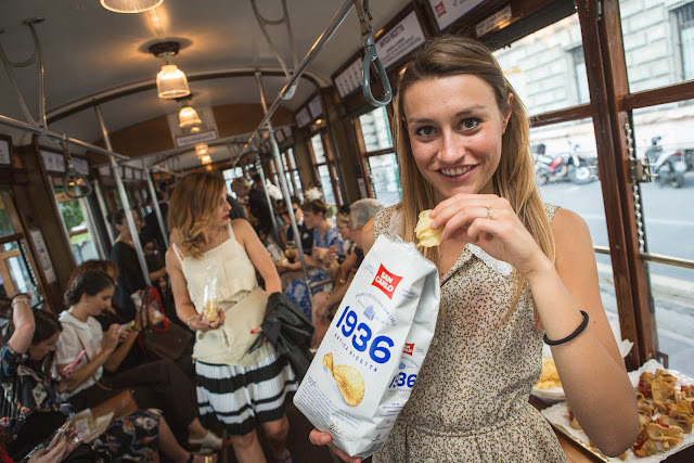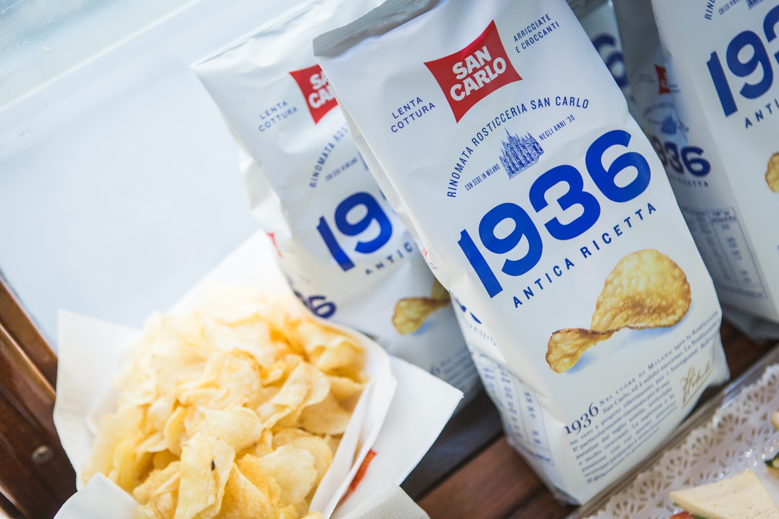 Io in quanto a stile ne sapevo poco, e non avendo potuto contare sul consiglio di Carlotta, che si trovava fuori città, mi sono arrangiata con quello che avevo. Fortunatamente San Carlo aveva pensato a tutto: a un tram, a una band, a un barman, ma soprattutto a loro: le nuove patatine realizzate con l’antica ricetta, quelle che hanno fatto la storia dell’azienda perché assolutamente rivoluzionarie per quegli anni.